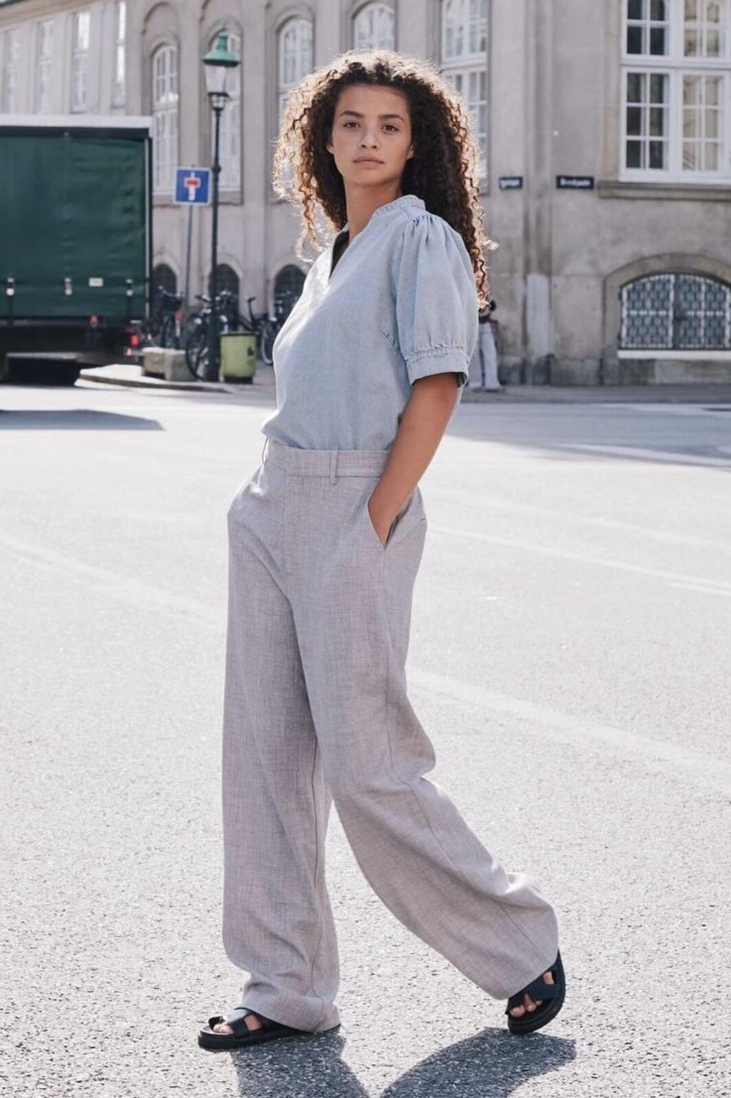 Denimbluse fra Neo Noir i stonewashed denim. Blusen har en V-utringning med bindebånddetalj og korte puffede ermer. Den lyseblå stonewash gir et avslappet utseende.