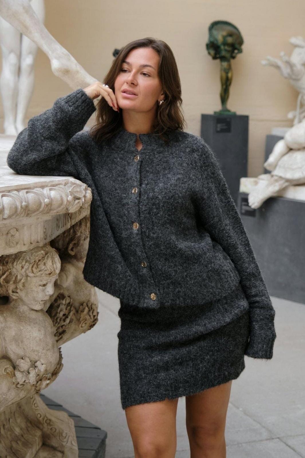 Sød strikket cardigan med ribdetaljer ved halsudskæringen, ærmekanterne og nederste kant. Cardiganen er gennemknappet med fine guldfarvede knapper med struktur. Modellen er 176 cm og bærer en størrelse 36.