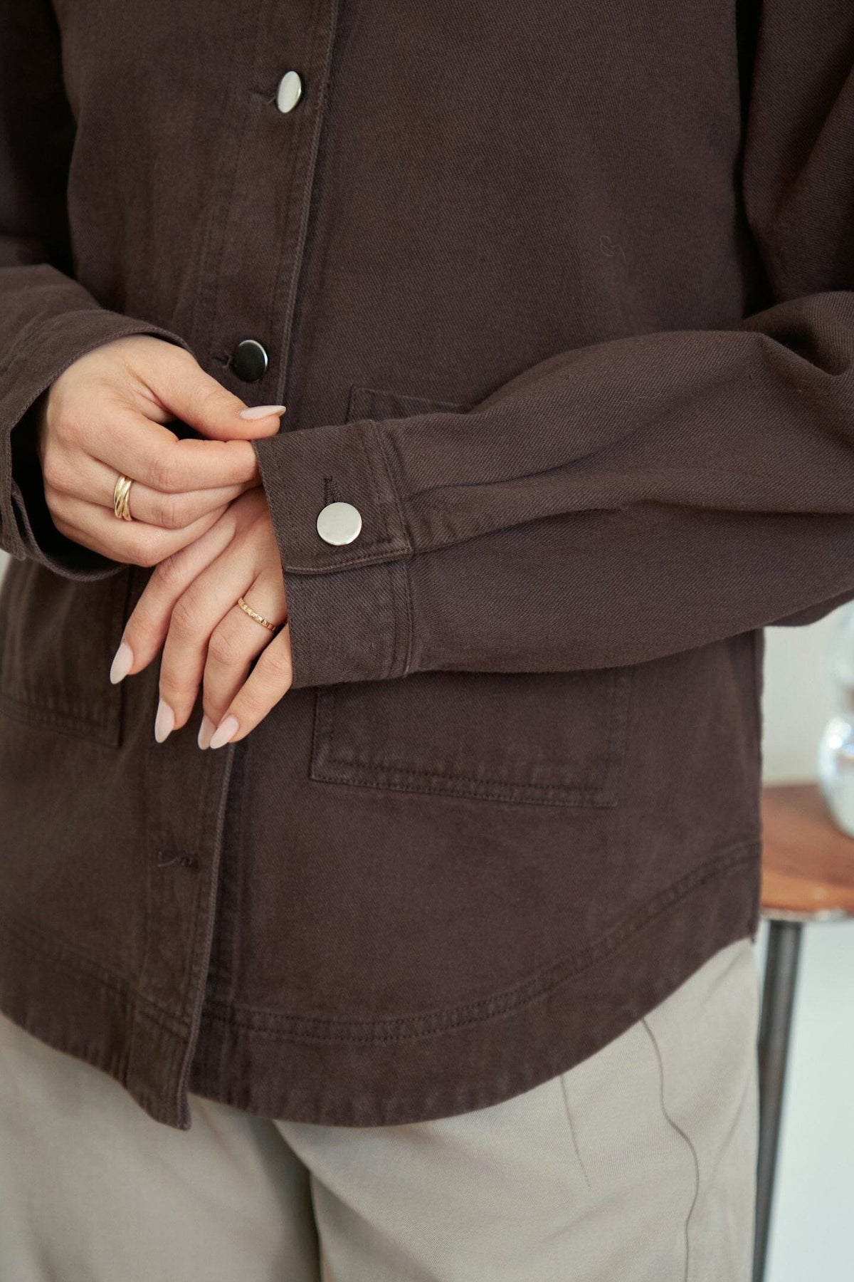 Mørkebrun jakke fra Neo Noir i kanvasmateriale. Jakken har en avslappet passform med knapper foran og to brystlommer med klaff. Den dekorative sømmen gir jakken et rustikt preg.