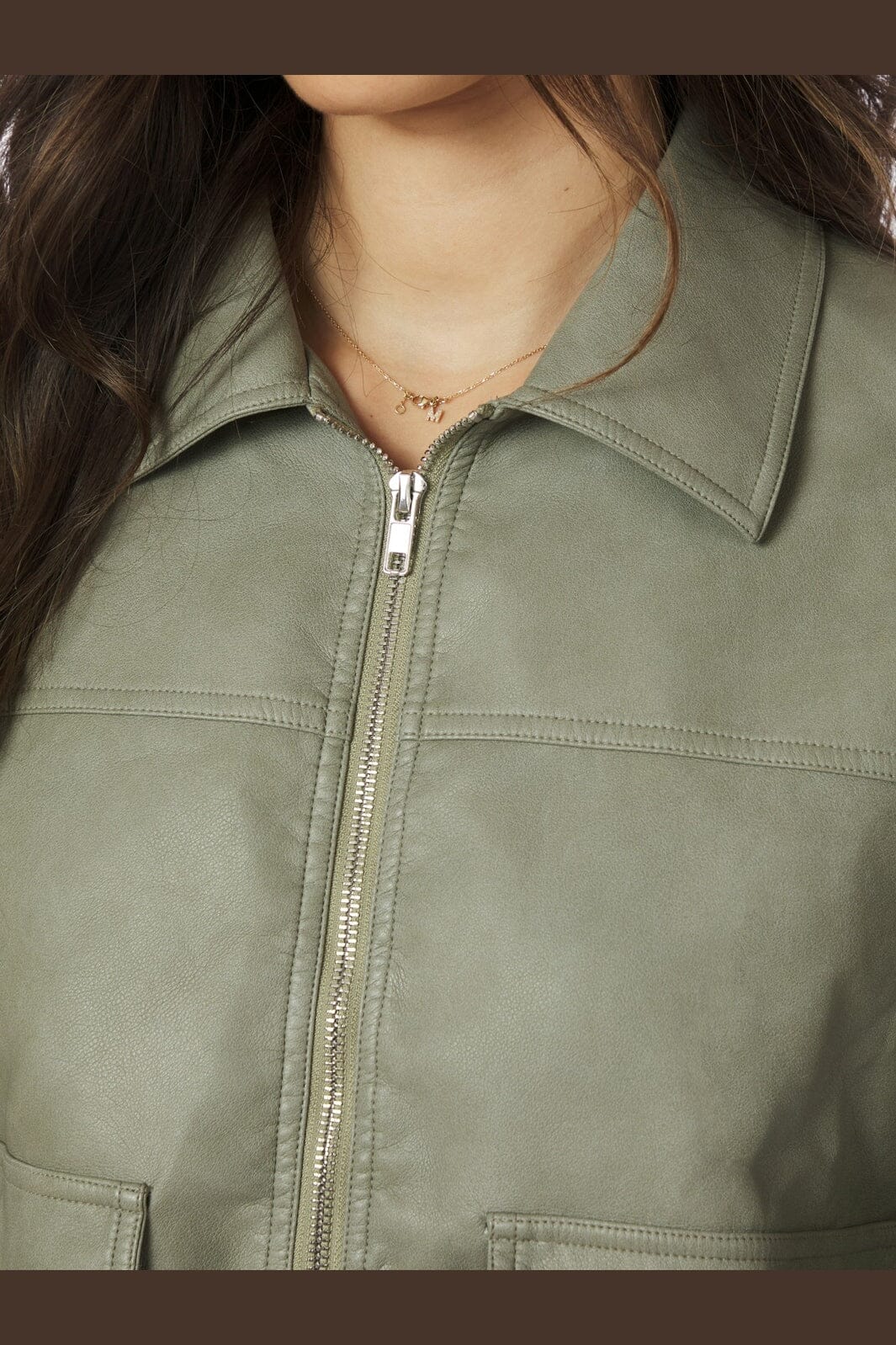 Faux skinnjakke fra Neo Noir i myk grønn nyanse. Jakken har en oversized passform med skjortekrage og glidelås foran. To store lommer med klaff på forsiden gir jakken et praktisk design.