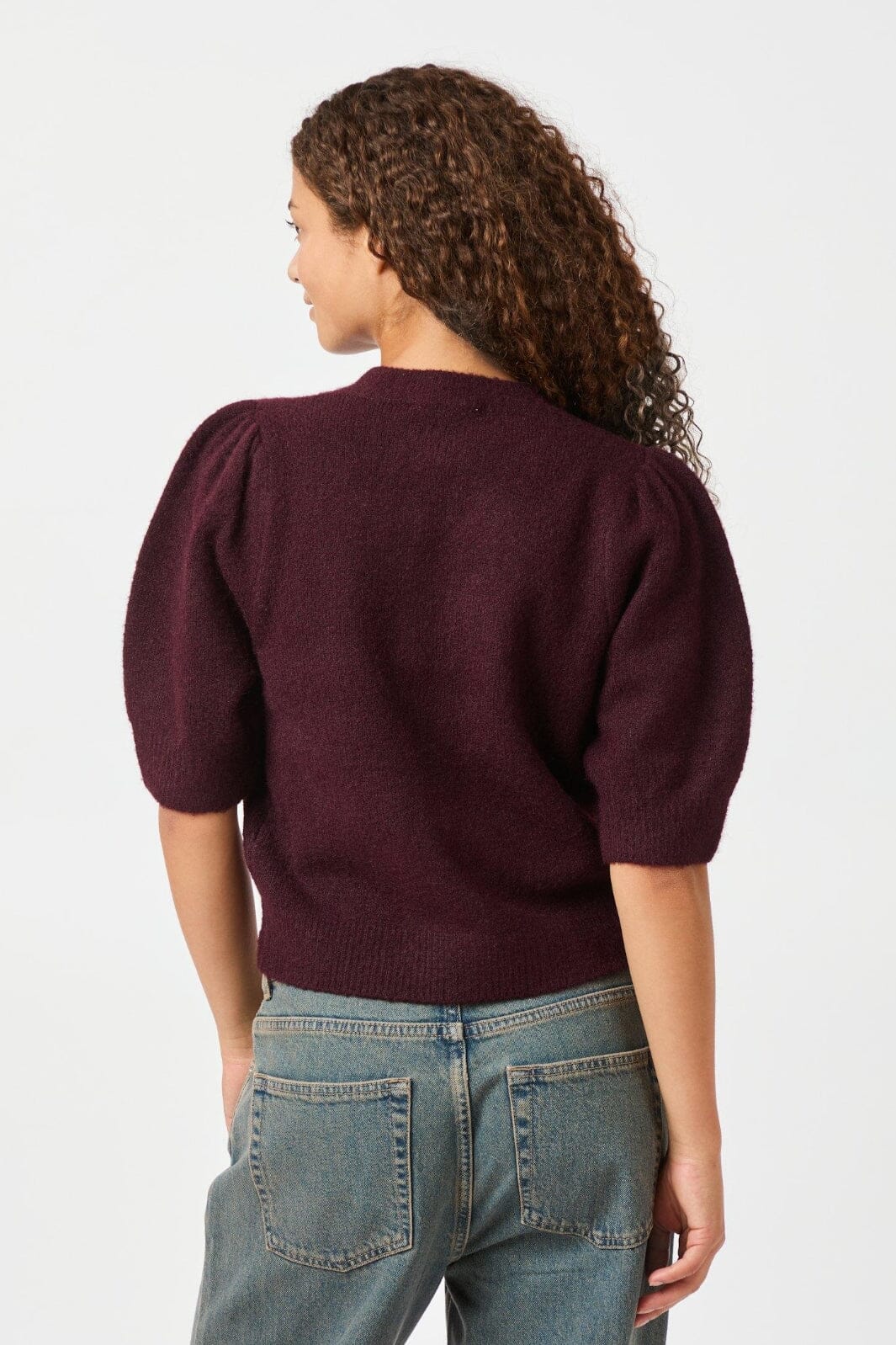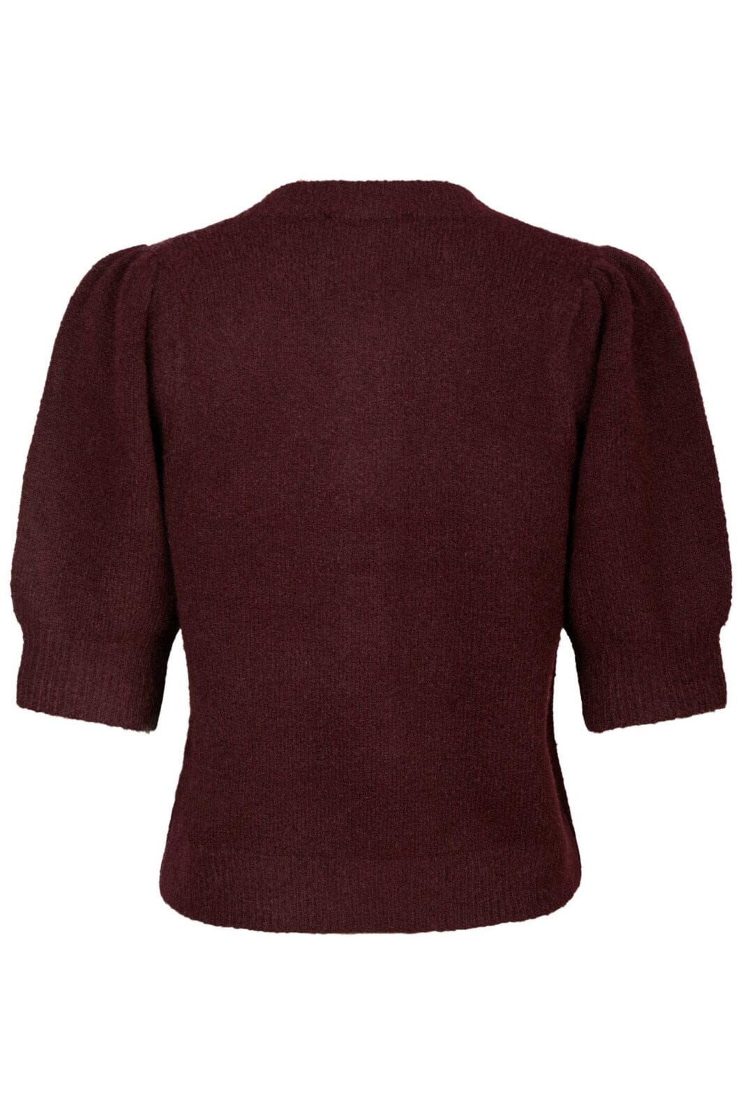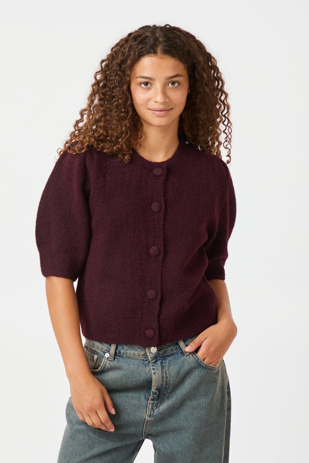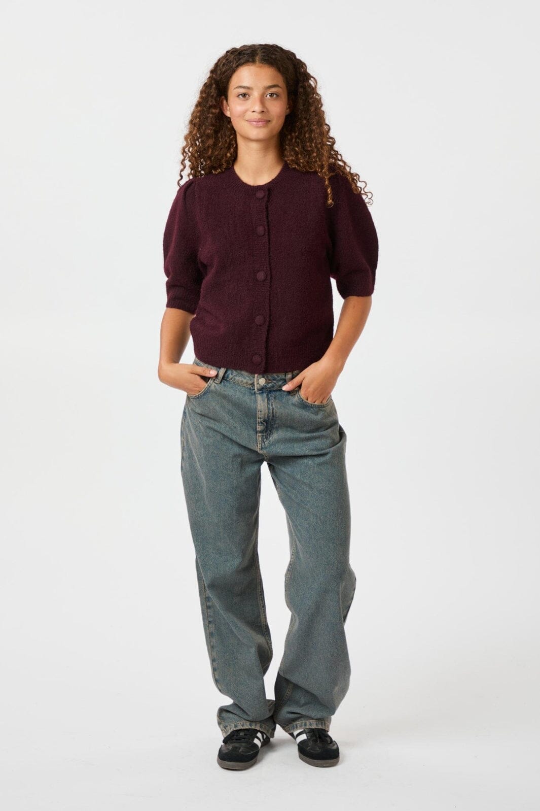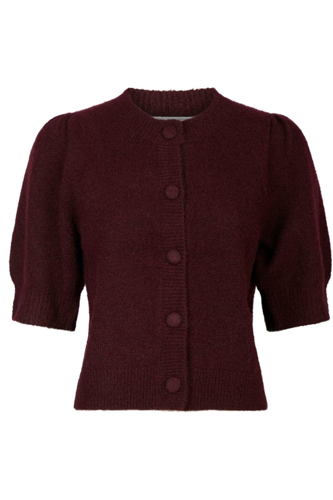 Vinrød cardigan fra Neo Noir med rund halsutskjæring. Den korte modellen har puffede ermer og knappelukking foran.