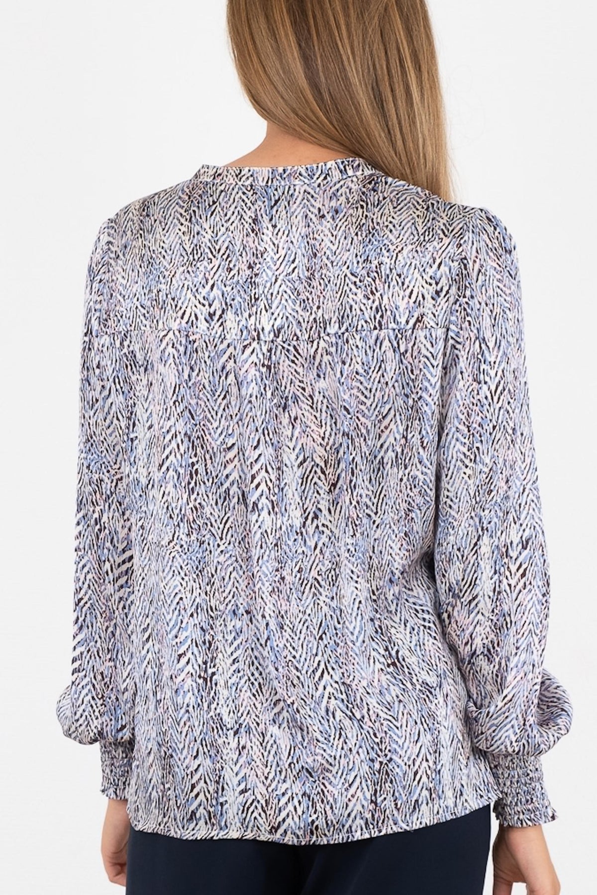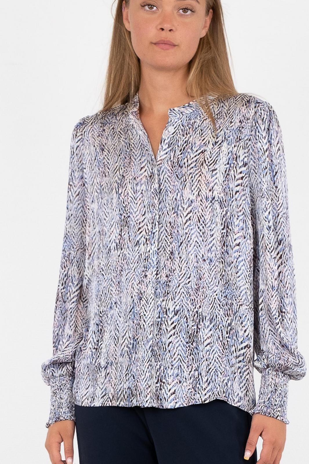 Bluse fra Neo Noir med et abstrakt mønster i blå, rosa og svarte nyanser. De lange ermene har puff og samlinger ved håndleddene, mens den løse passformen gir god bevegelsesfrihet.