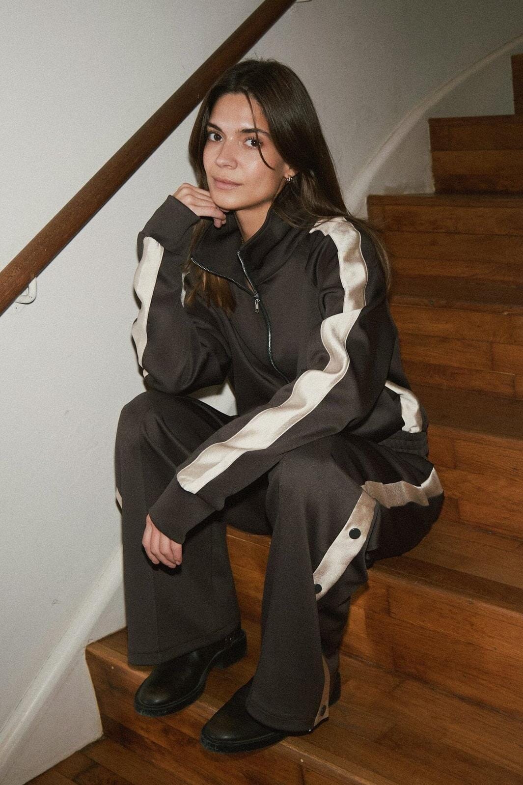 Cool track suit genser med stripedetaljer langs ermet og glidelås. Modellen er 176 cm og har på seg størrelse 36