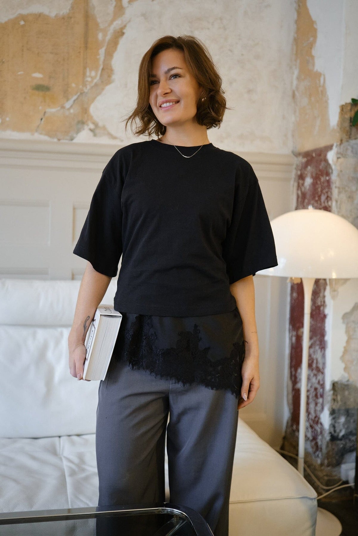 Svart blondetopp fra Neo Noir med tynne spaghetti-stropper. Toppen har en v-utringning og en asymmetrisk kant med blondedetaljer, som gir et unikt snitt.