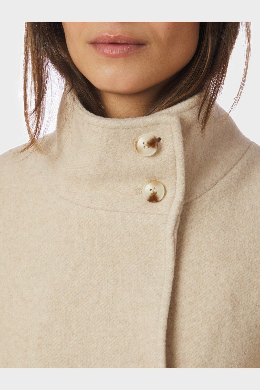 Sandfarget cape fra Neo Noir med brede ermer og høy krage. Den har to knapper ved halsen og et knytebånd i midjen, som gir mulighet for å justere vidda.