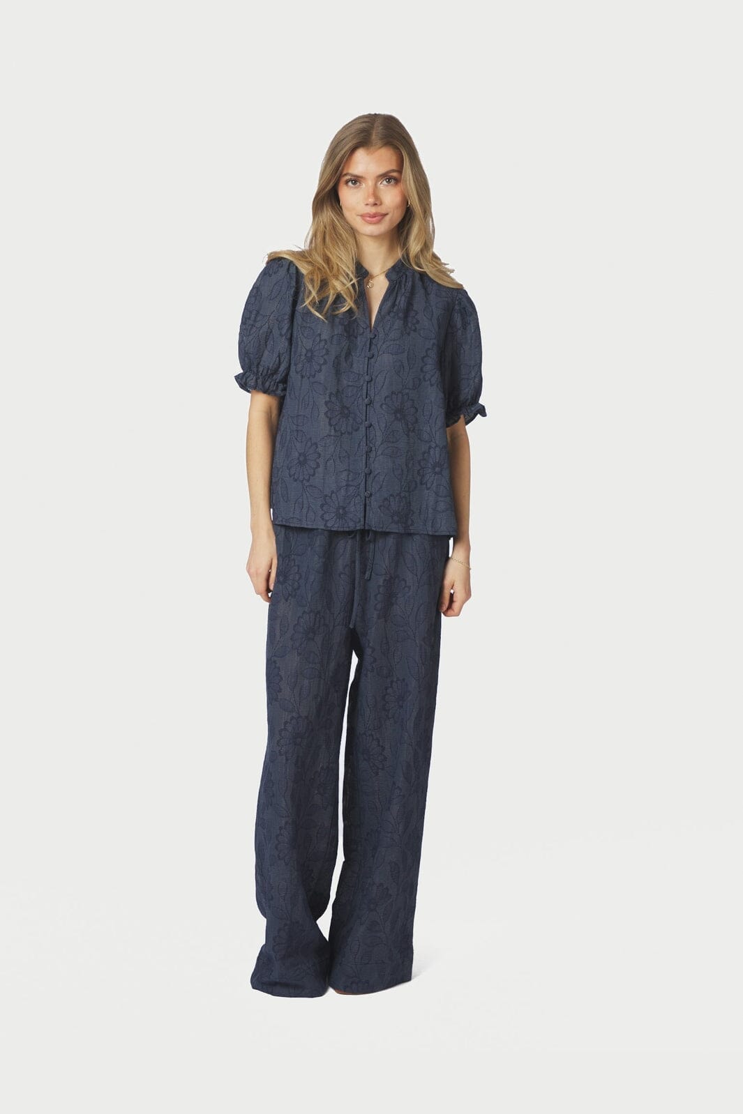 Mørkeblå bluse fra Neo Noir med et blomstrete og stripete mønster. Blusen har korte pufferm, V-hals og knappelukking foran.