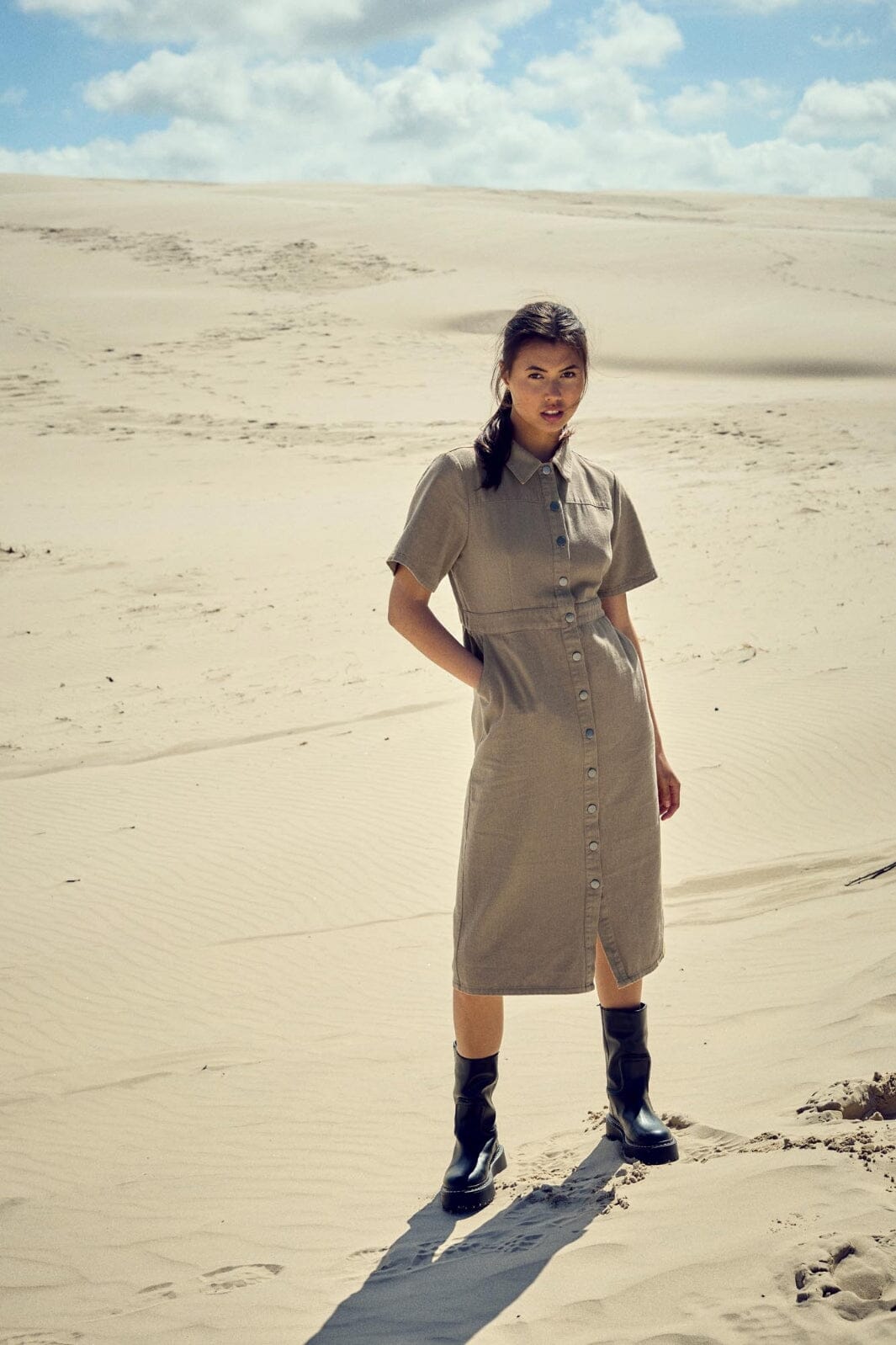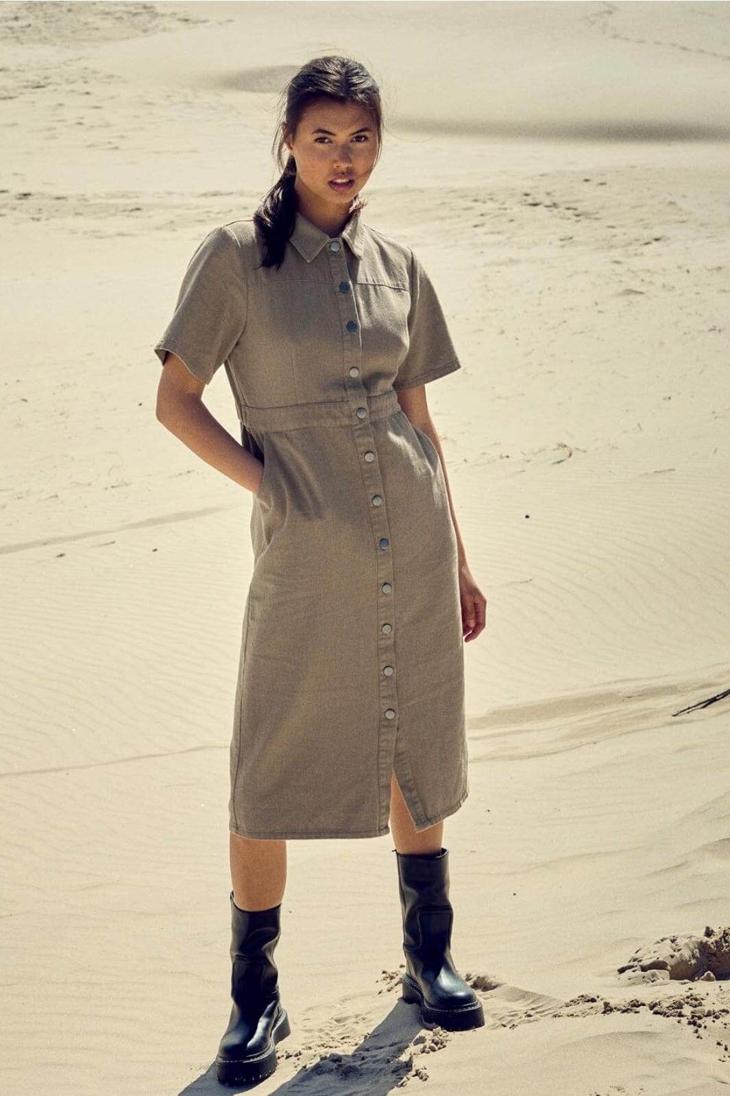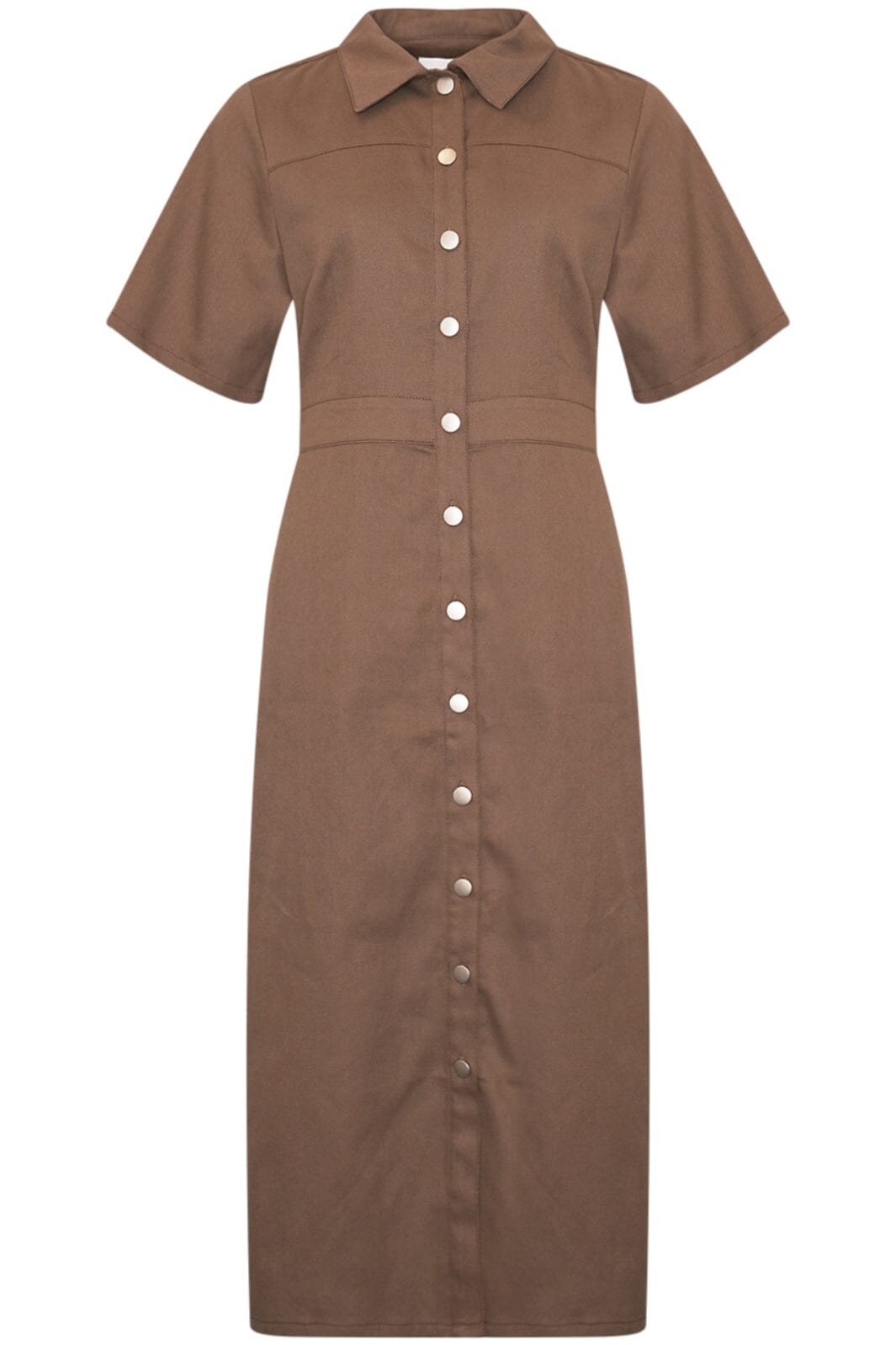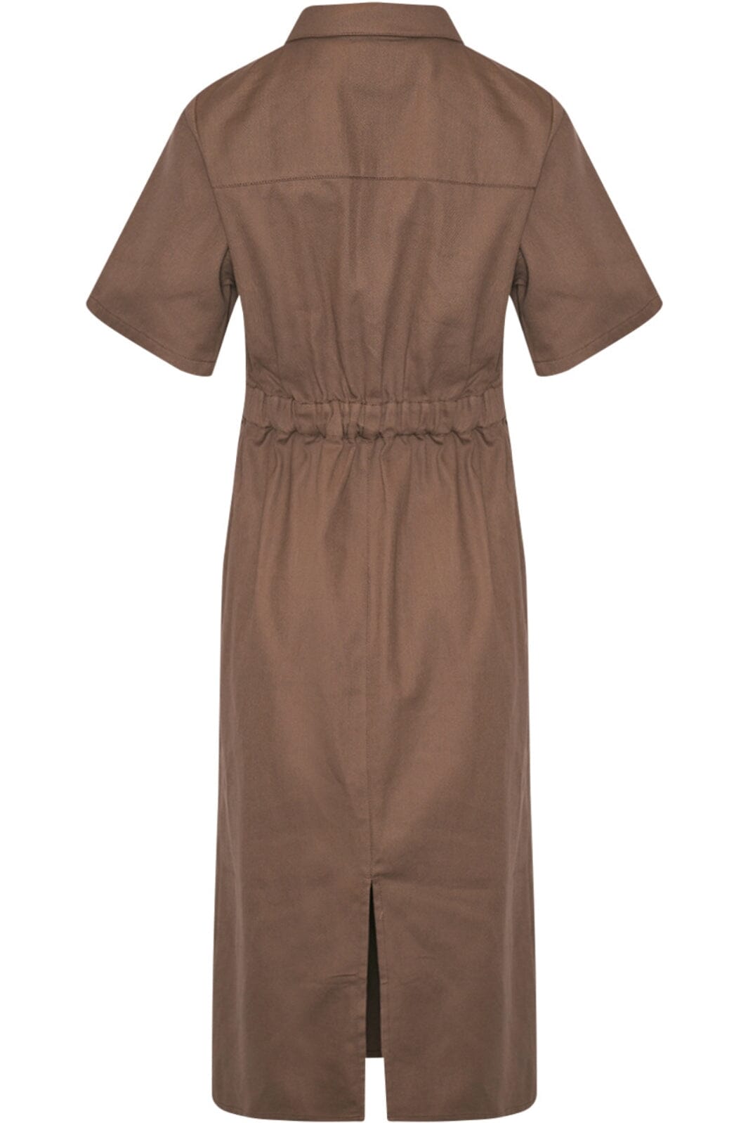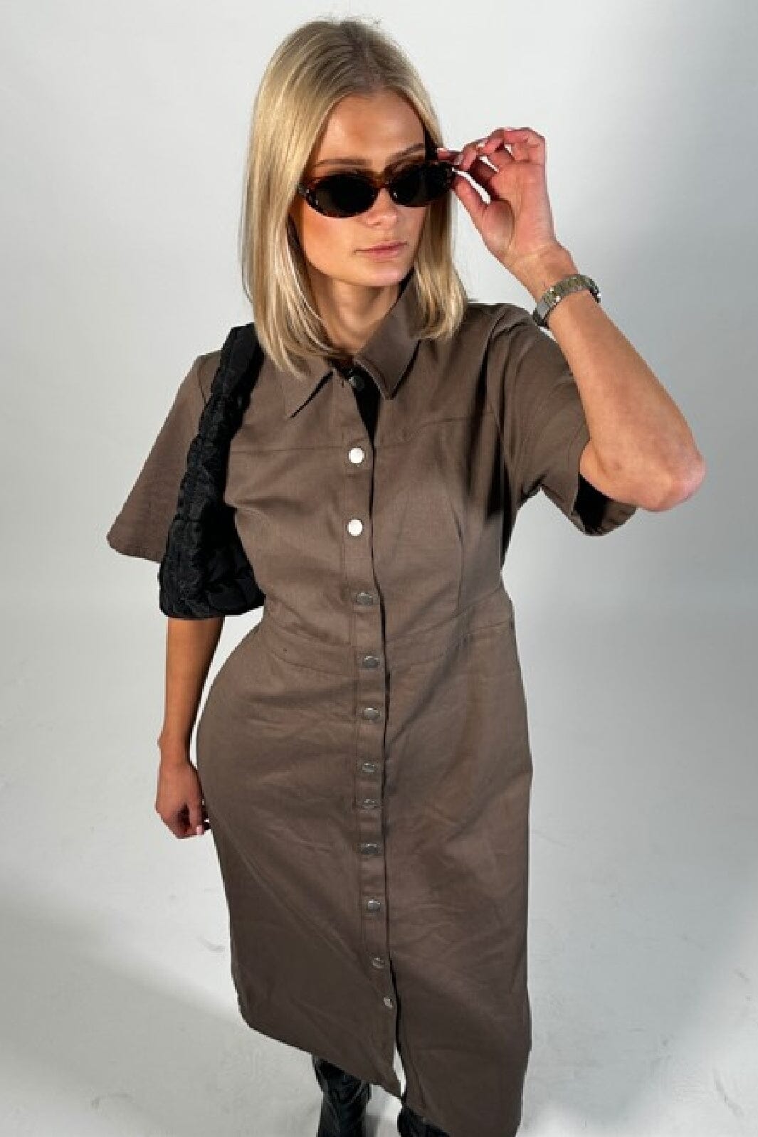 Lang kjole fra Noella i brun morel-farge. Kjolen har knapplukking foran, skjortekrage og korte ermer. Den slanke passformen og lange lengden gir et rent uttrykk.