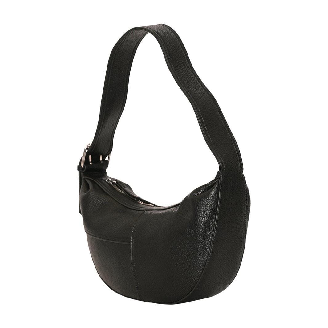 Svart skulderveske fra Noella med buet form og pebret overflate. Vesken har en romslig innvendig seksjon og en praktisk glidelås i toppen.