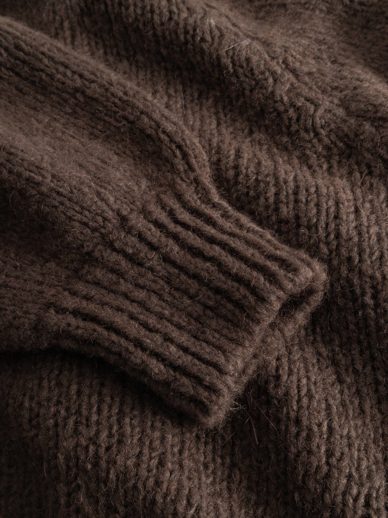 Mørkebrun cardigan fra Noella i en myk materialblanding med mohair og ull. Den løse passformen og de lange ermene gir god plass til lag-på-lag-styling.