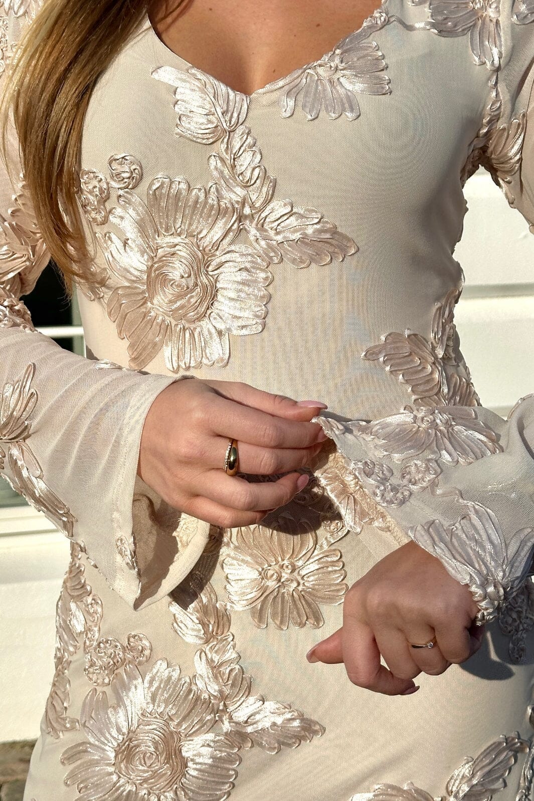 Kortermet meshkjole fra Noella i kremhvit. Kjolen har broderte blomster over hele designet og en V-halsutskjæring. De lange ermene og knelengden gjør den brukbar året rundt.