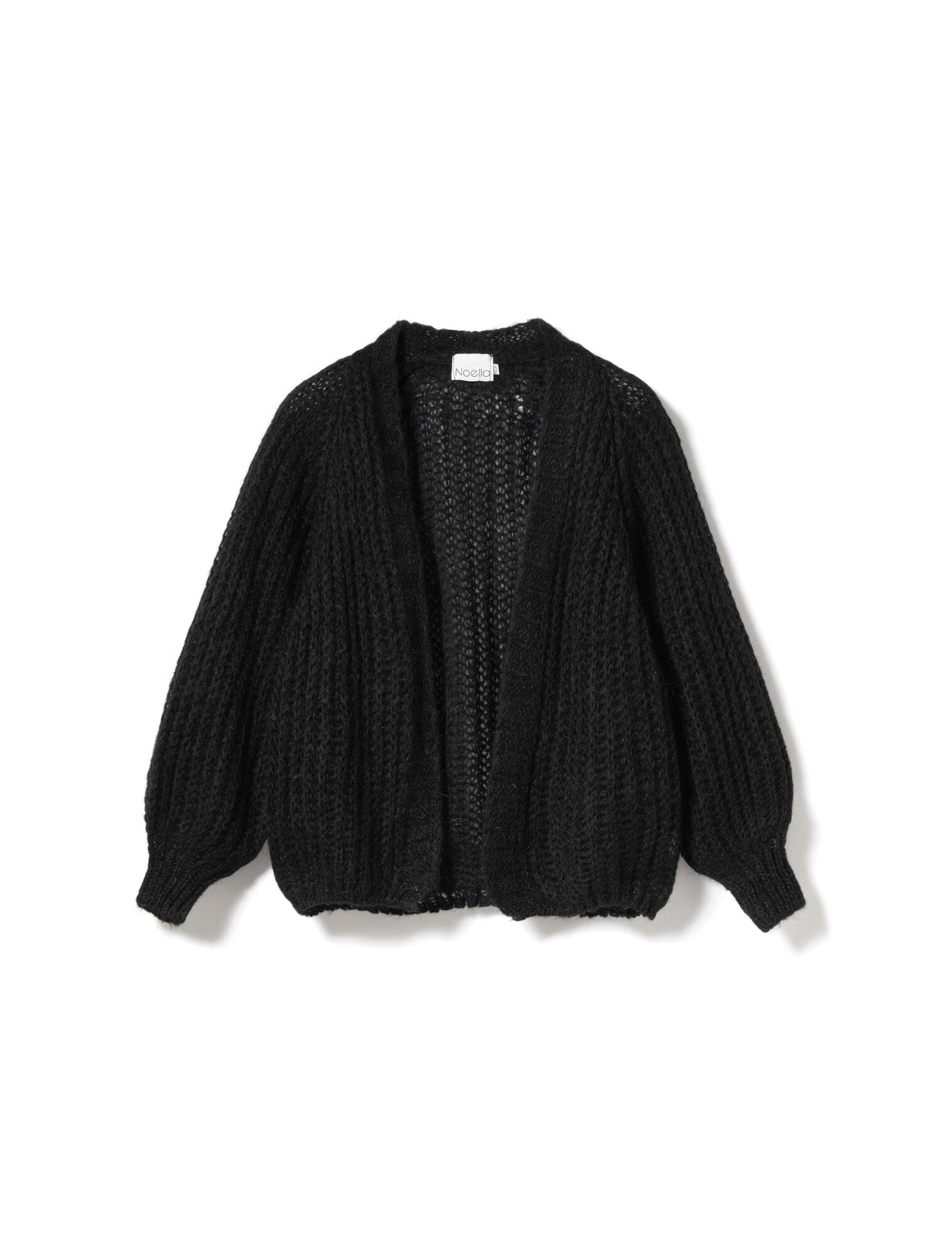 Svart cardigan fra Noella med strikket tekstur og løs passform. De lett puffede ermene og den åpne fronten gir cardiganen et enkelt og avslappet uttrykk.