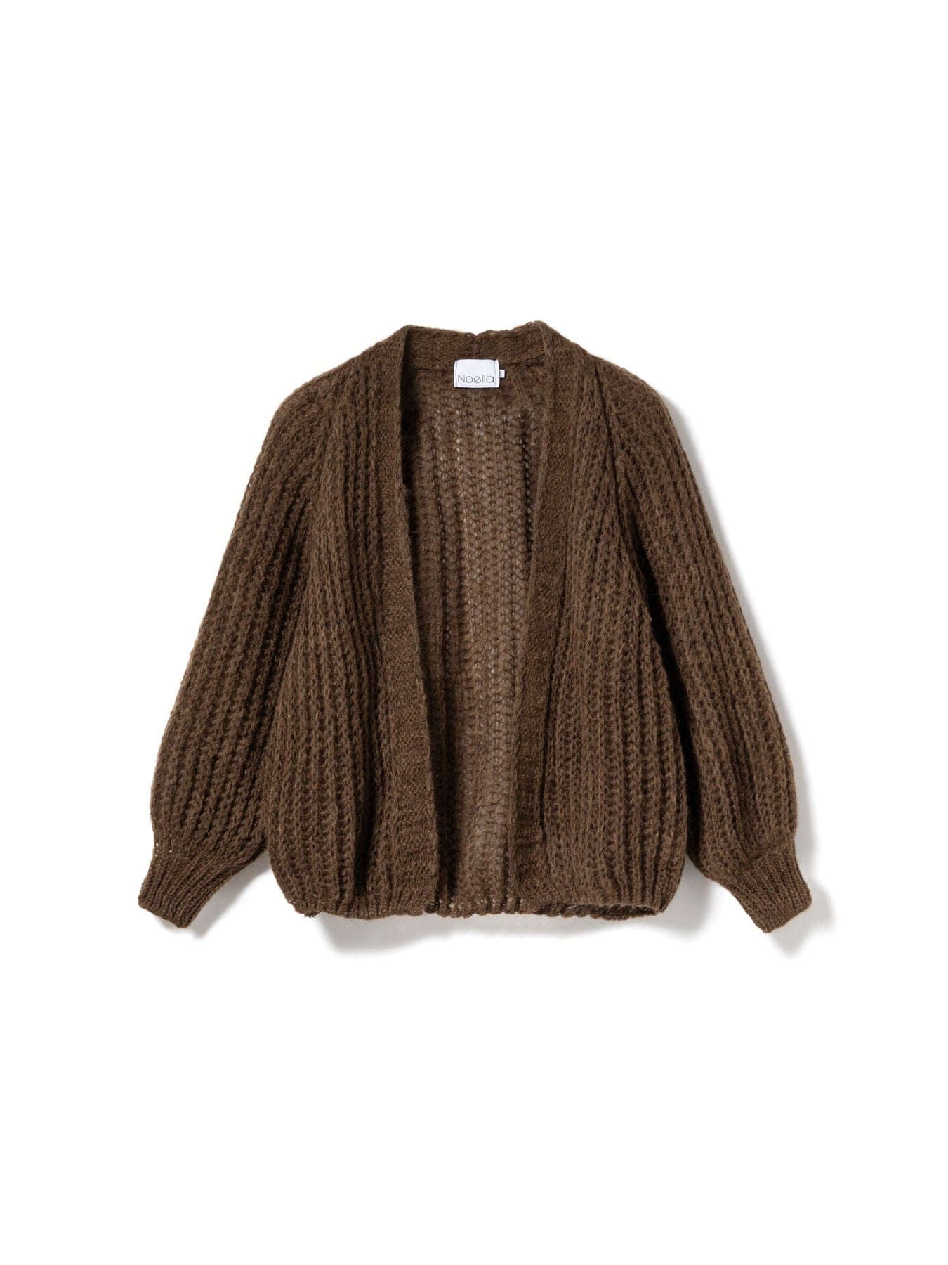 Brun strikket cardigan fra Noella med åpent strukturmønster. Den løse modellen har ballongformede ermer og en åpen front uten lukking. Den er strikket i en melert sjokoladebrun nyanse.