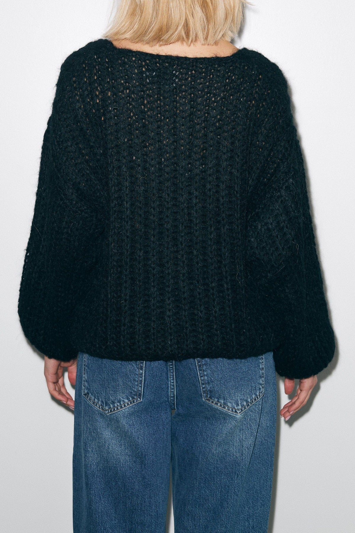 Svart strikkegenser fra Noella med strukturert strikkemønster. Den løse passformen og de lange ermene med ballongeffekt gir genseren et karakteristisk uttrykk.