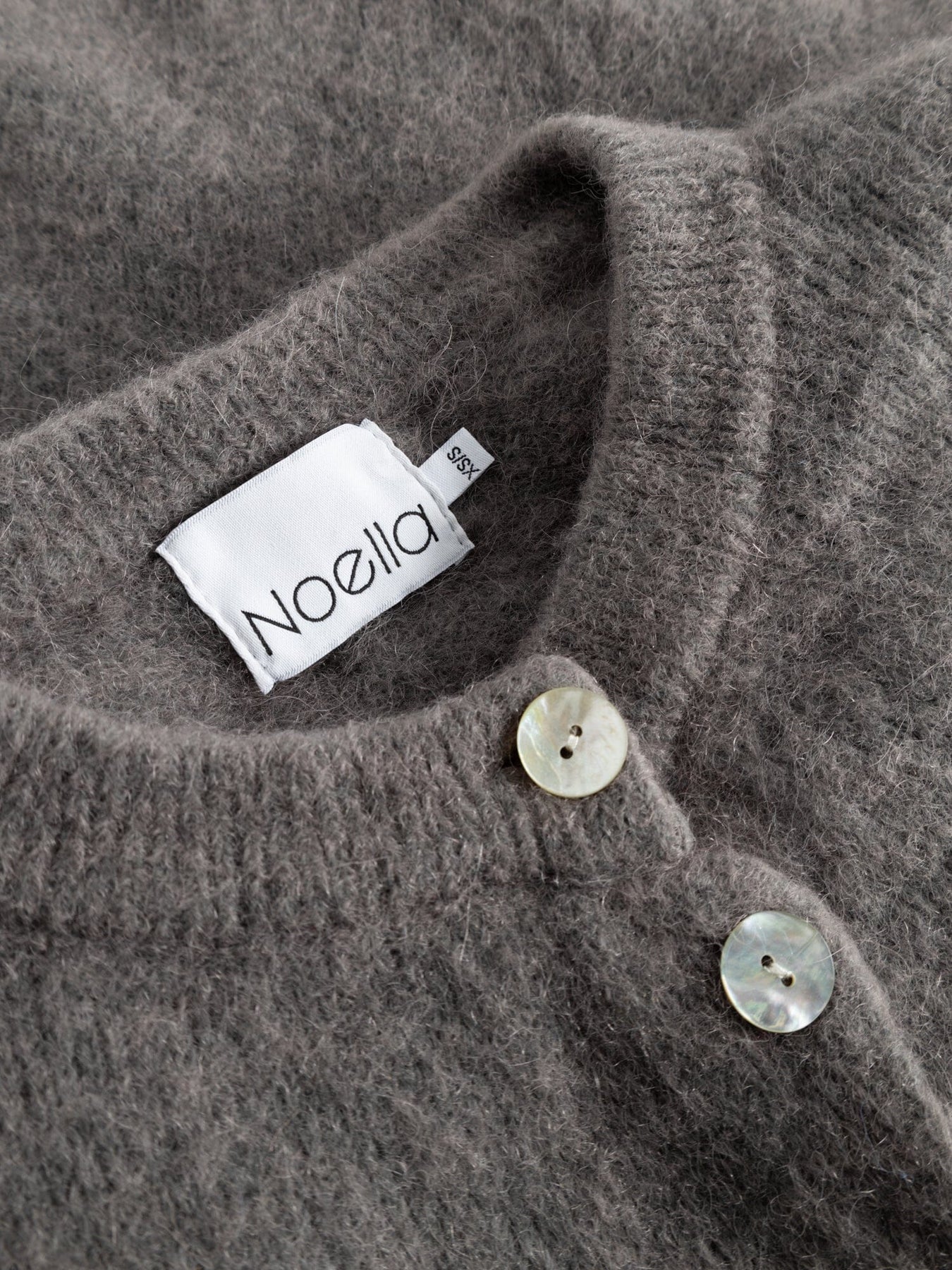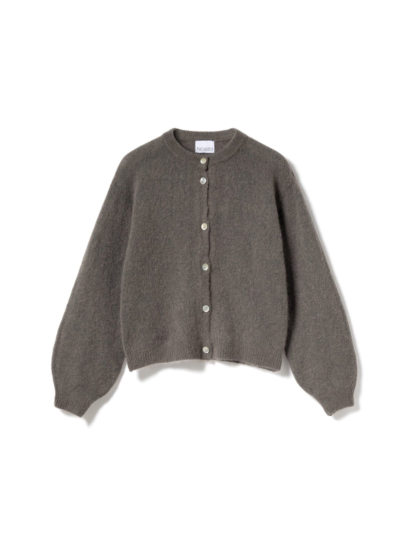 Strikket cardigan fra Noella i kaffebrun. Den har rund hals, knapper foran og brede ermer med lett puff. Materialet er mykt og fluffy med en varm følelse.