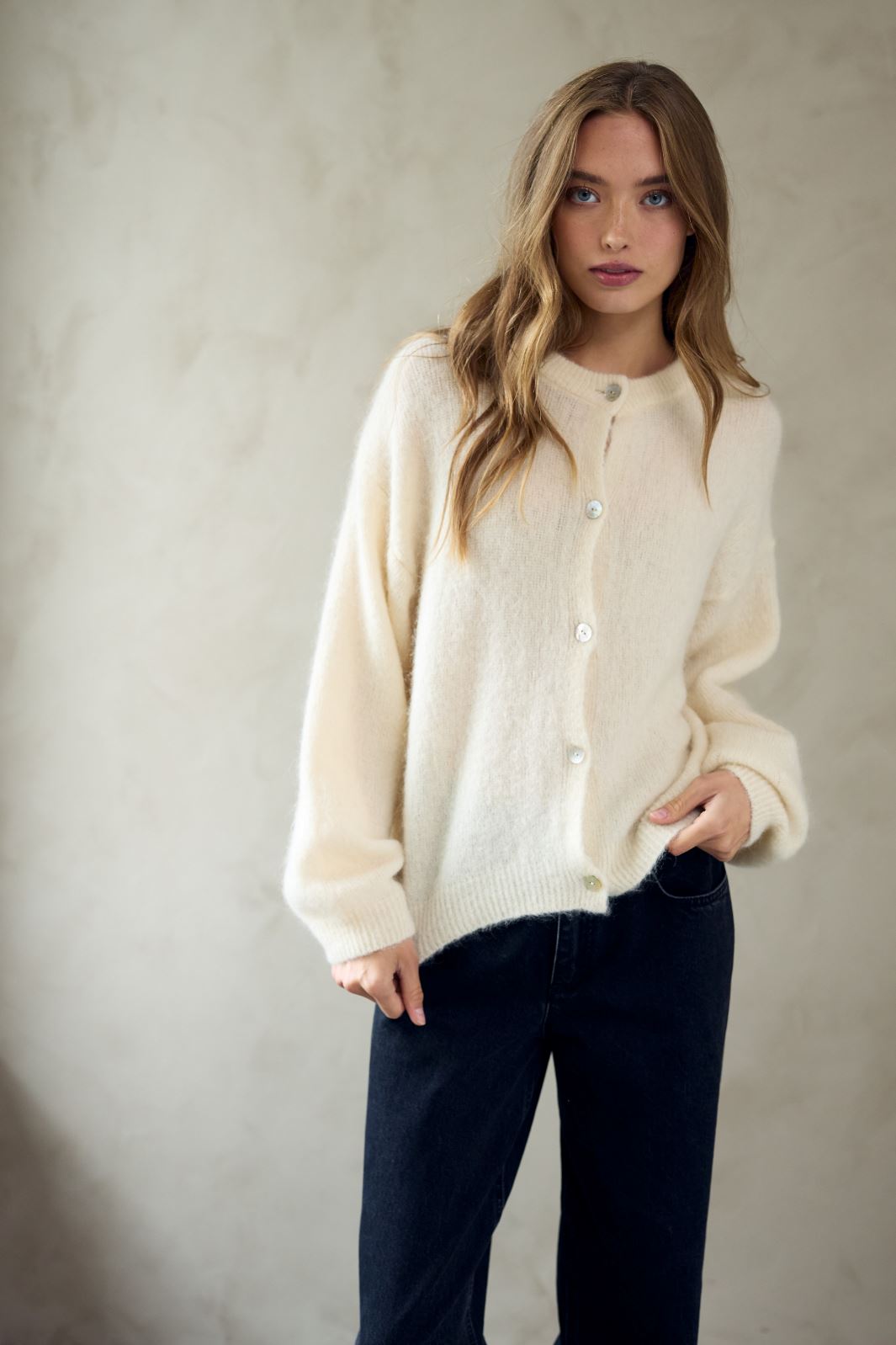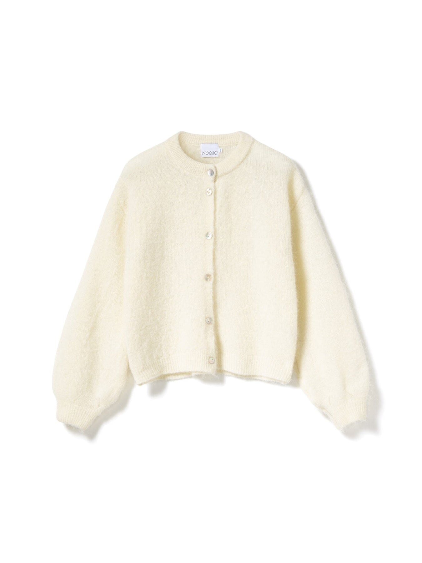 Cremehvit cardigan fra Noella med rund hals og knapplukking. Den myke strikkcardiganens nøytrale farge gjør den lett å kombinere med andre farger i garderoben.