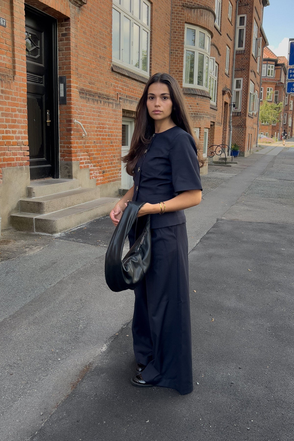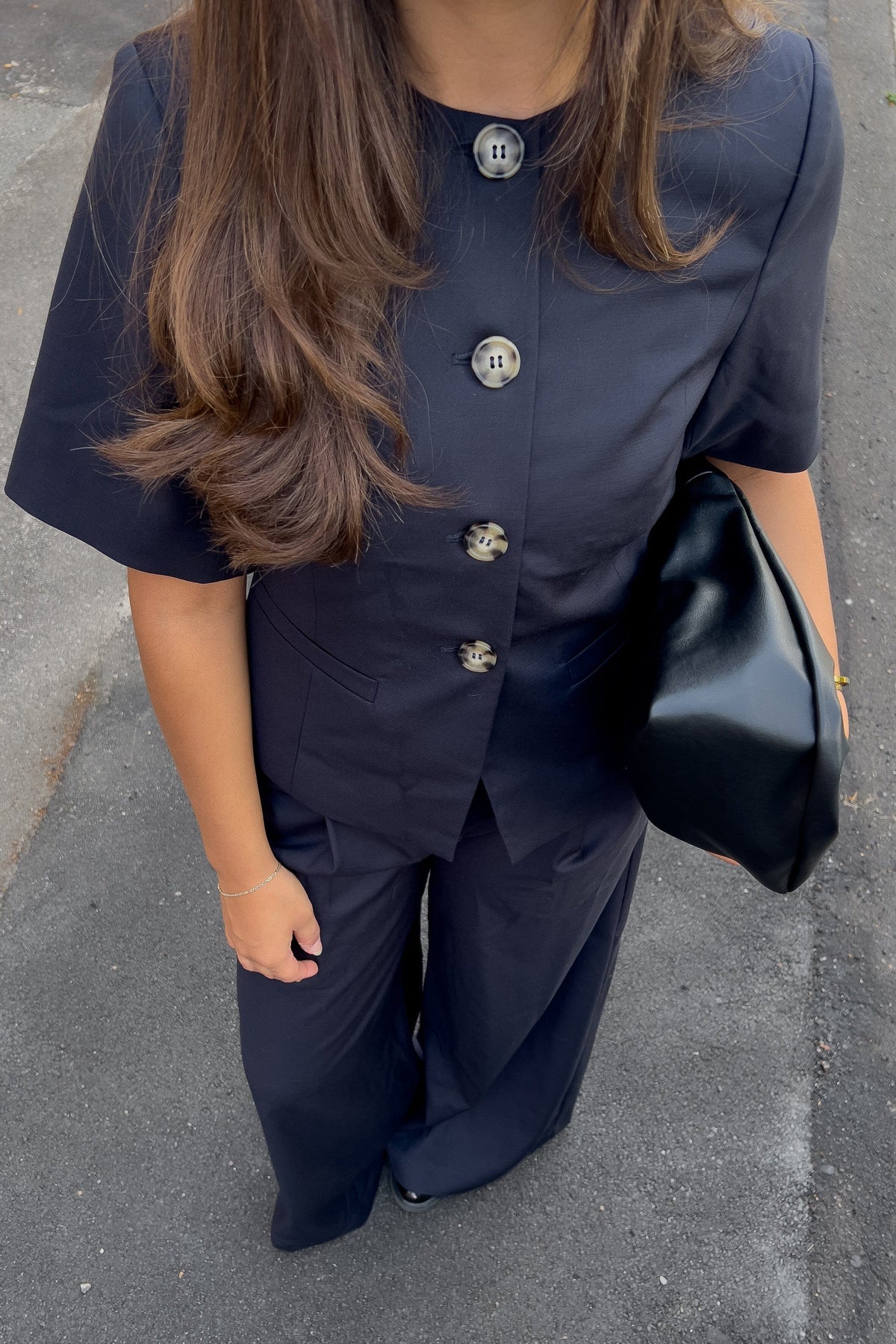 Svart blazer fra Noella med korte ermer og rund halsutskjæring. Store knapper pryder forsiden, og to sidelommer gir blazeren et praktisk design.