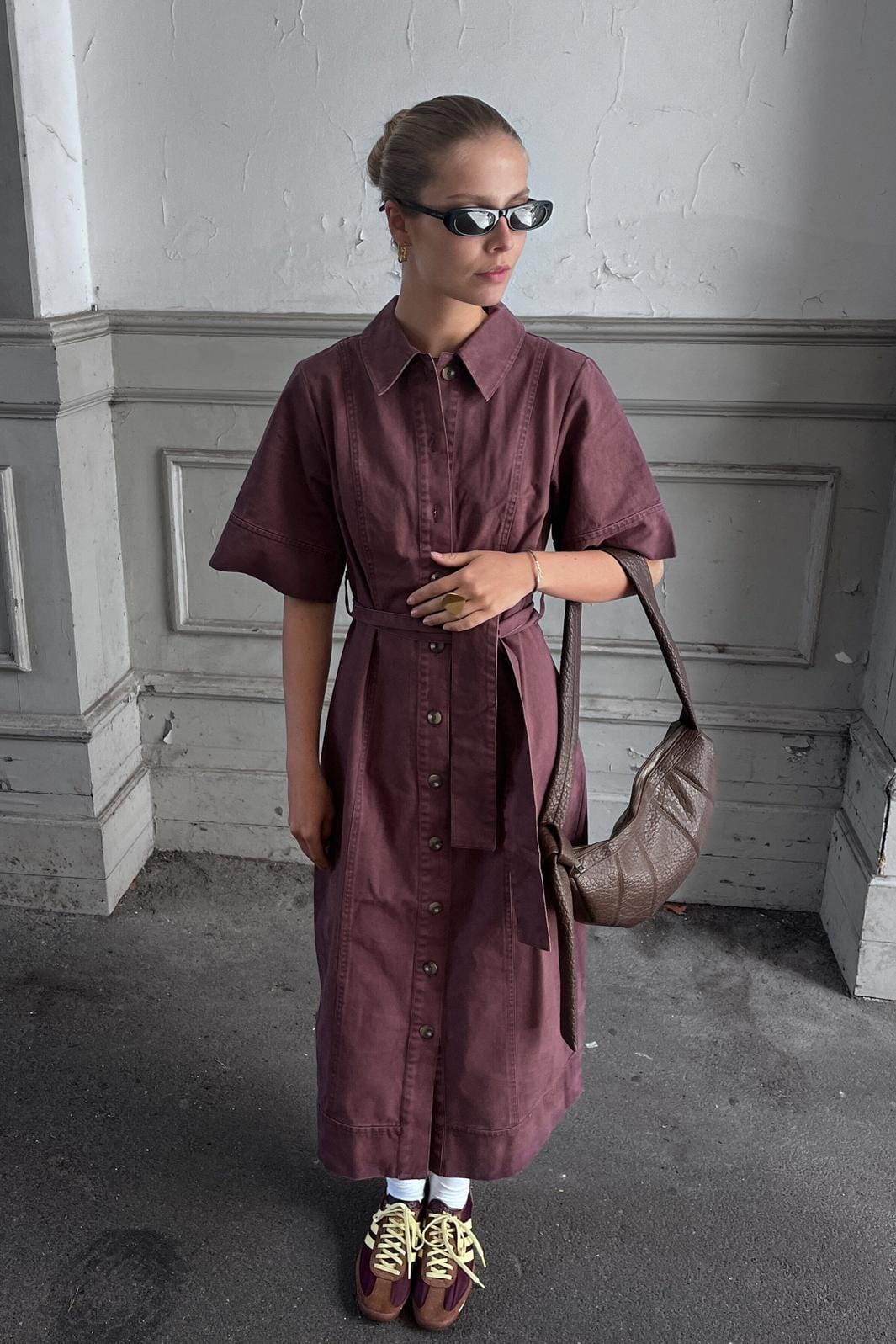 Skjortekjole fra Noella i fargen Crushed Berry, en mørk rød-lilla nyanse. Kjolen er laget av 100 % bomull og har dekorative sømmer.