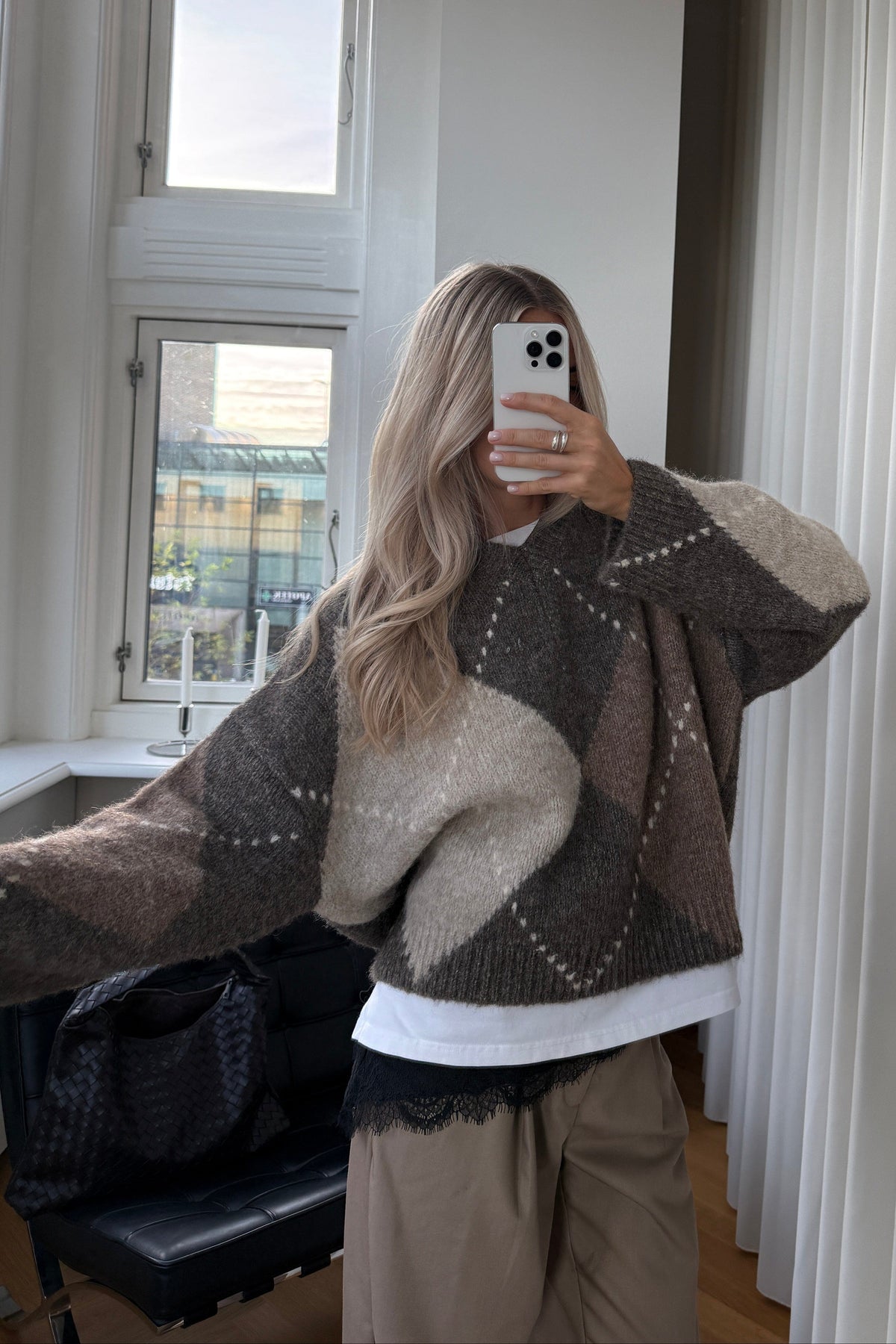Strikkegenser fra Noella i en blanding av brune og lyse beige nyanser. Genseren har et klassisk argyle-mønster med dekorative sømmer.