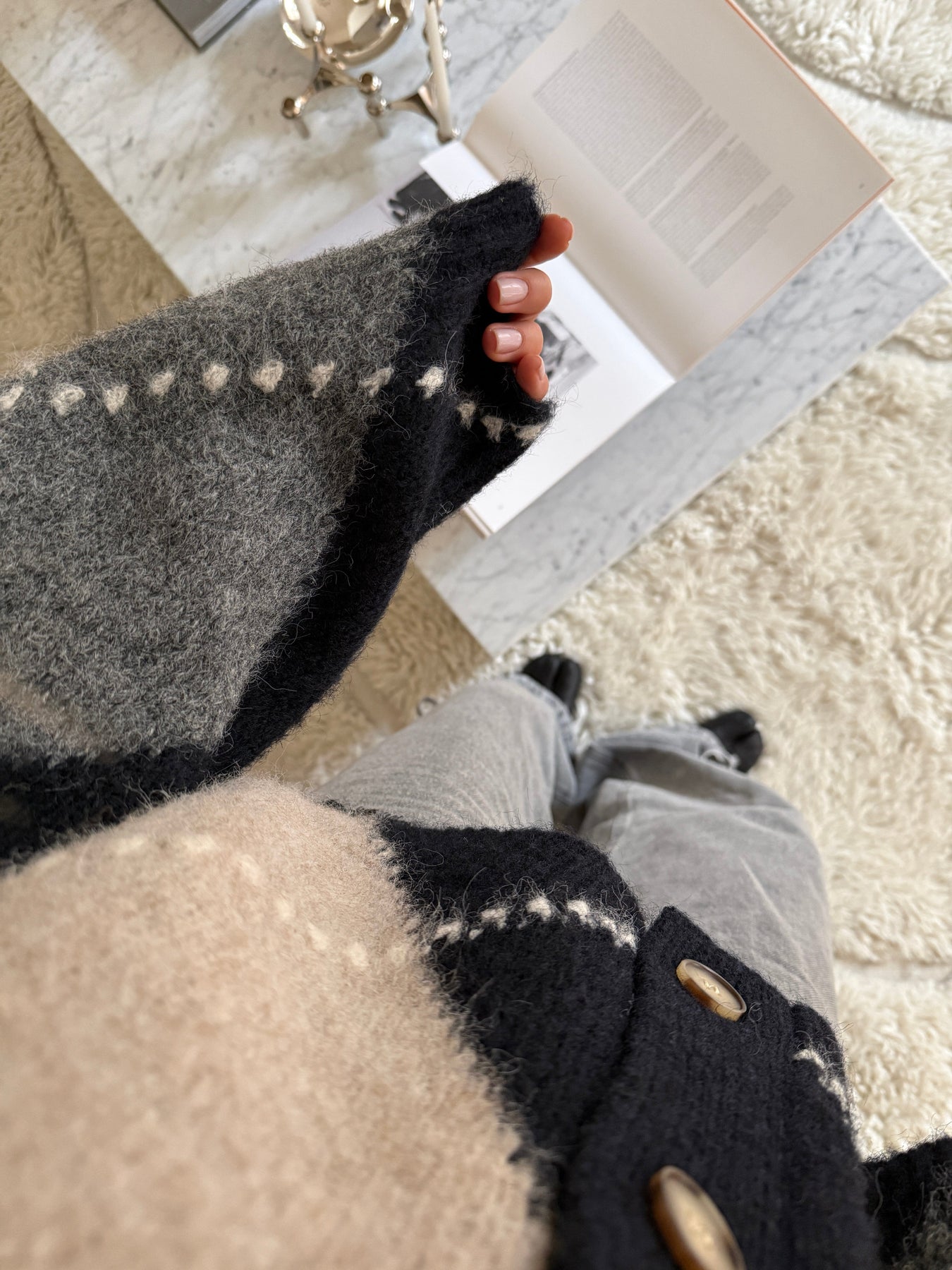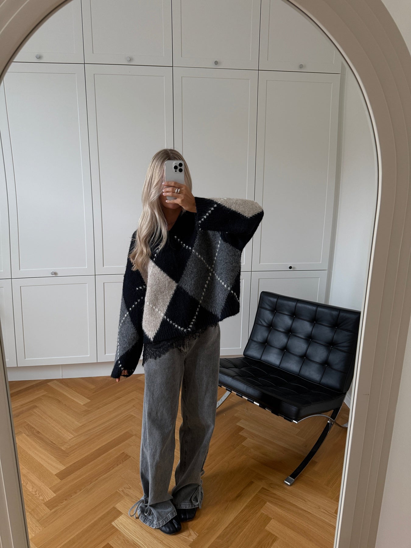 Strikkegenser fra Noella med store diamantformede mønstre i mørkeblå, grå og beige. Den har V-hals og lange ermer med en løs passform.