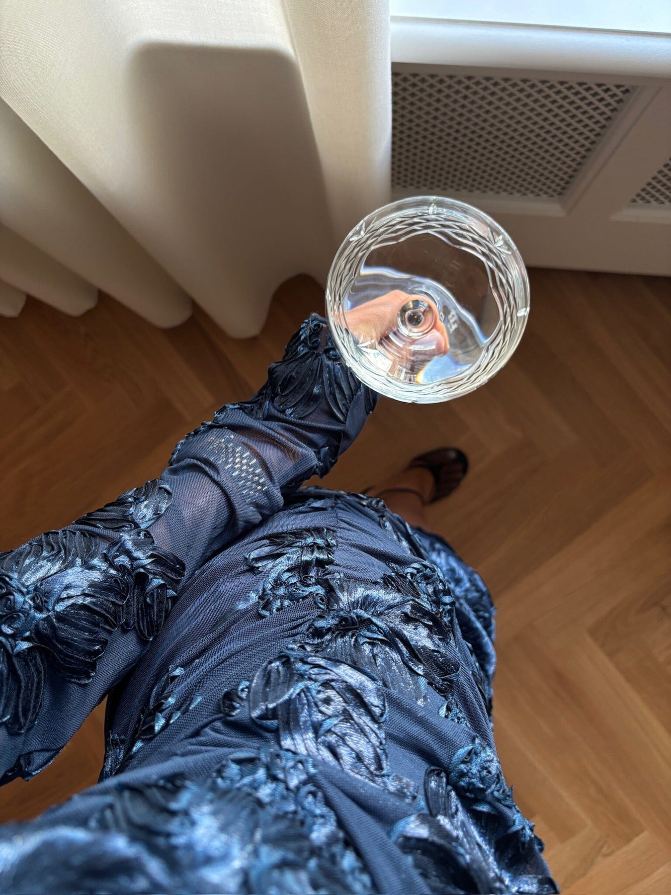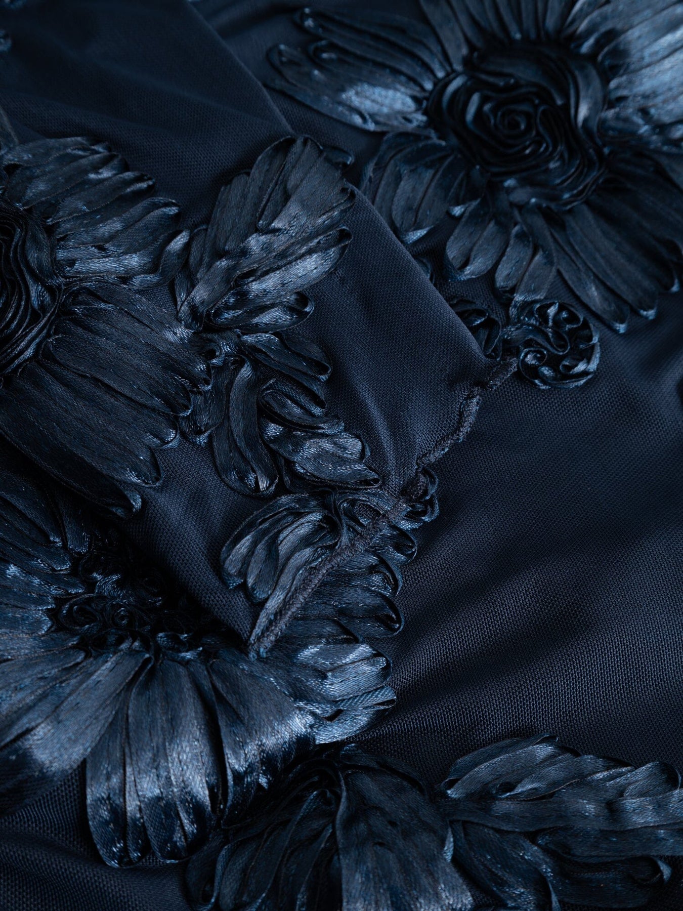 Mørkeblå kjole fra Noella med 3D-blomstermønster. Kjolen har en kroppsformet passform og lange ermer. Stretchbart meshstoff med broderi og volanger gir kjolen et særegent uttrykk.