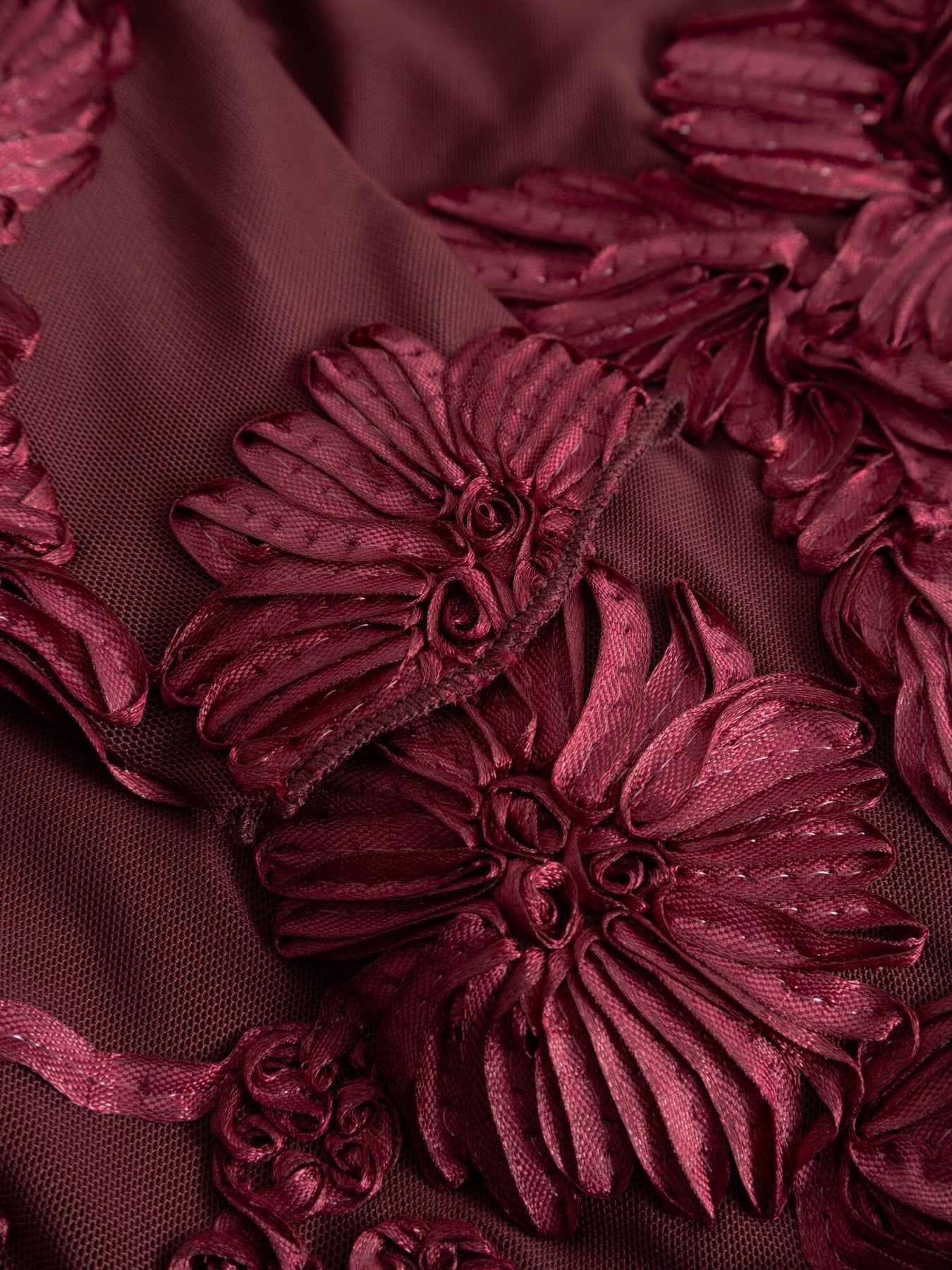 Vinrød kjole fra Noella med blomsterbroderi. Kjolen har lange ermer og en tettsittende passform i stretchbart meshstoff med rynkede detaljer i sidene.
