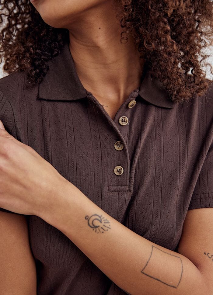 Topp fra Noella i brun sjokoladefarge. Toppen er laget av 100 % bomull og har blonderdetaljer, polokrage og knappelukking foran.