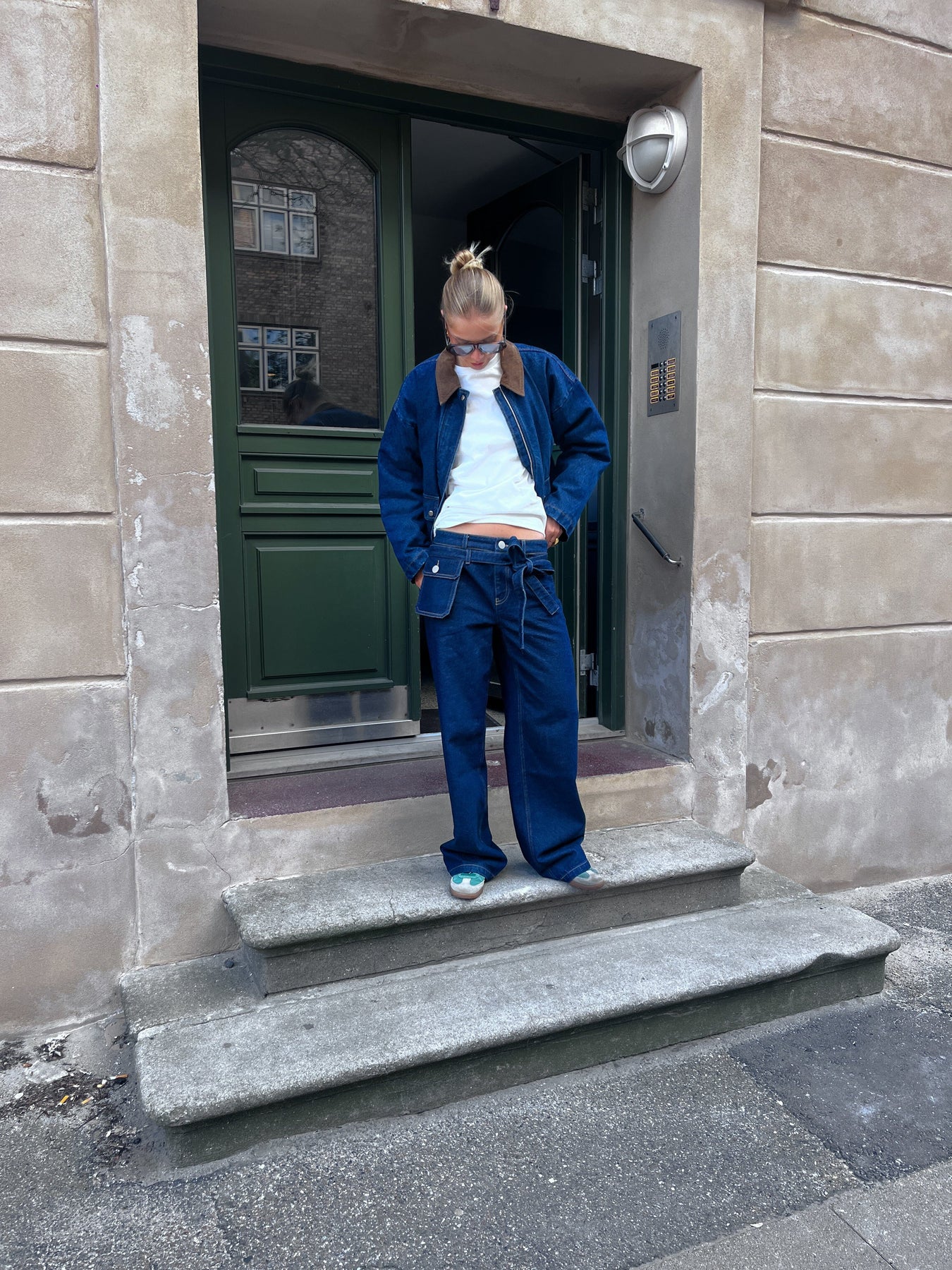 Denimjakke fra Noella, laget av blå denim med en brun krage. Jakken har en vintagevask og dekorative sømmer.