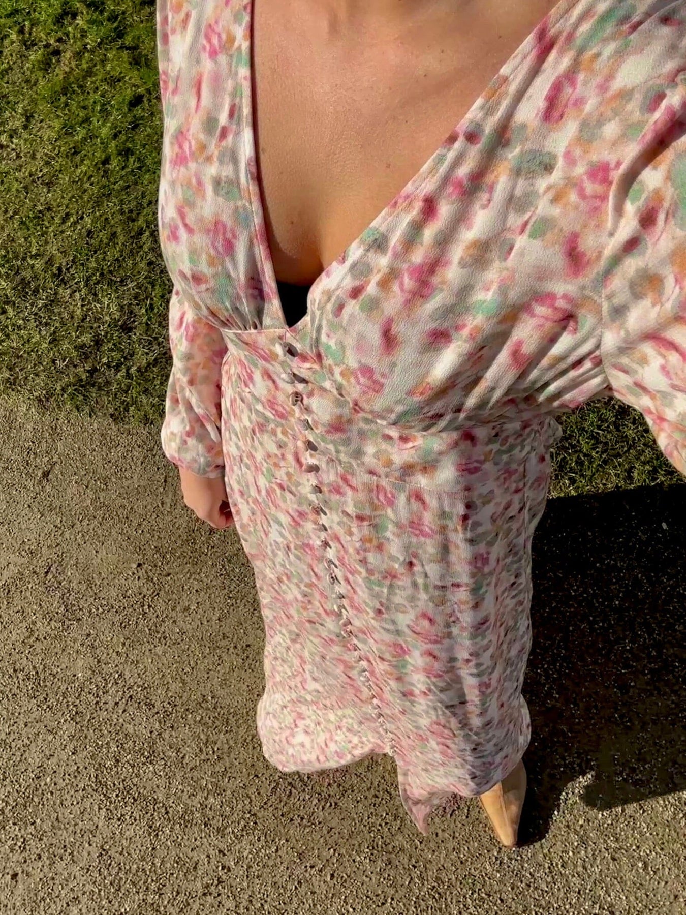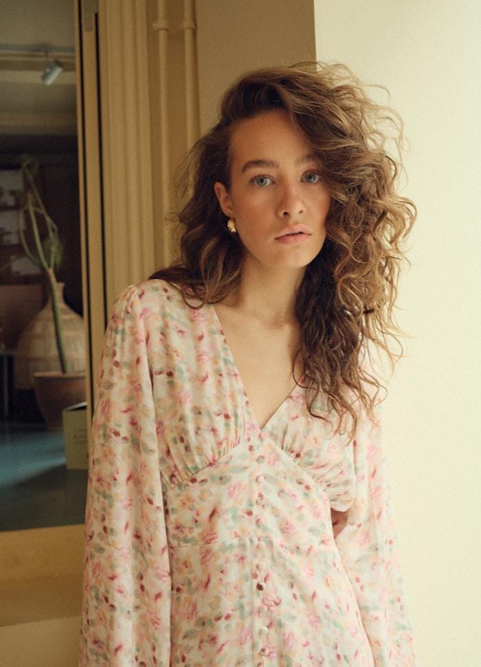 Maxikjole i lyserødt blomsterprint fra Noella. Kjolen har knapper hele veien ned foran, V-utskjæring og lange ermer med volum. Den løse passformen og det lette stoffet gir en avslappet silhuett.