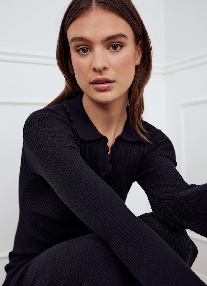 Svarte strikkjole fra Noella med polokrage. Kjolen har en slank passform og en lengde til midten av leggen. Den passer til både hverdagen og festlige anledninger.