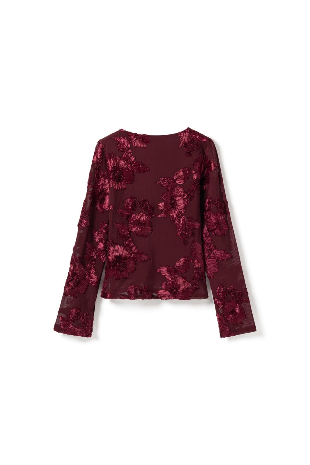 Topp fra Noella i en mørk rød nyanse. Toppen har lange ermer og et blomstrete mønster med broderi.