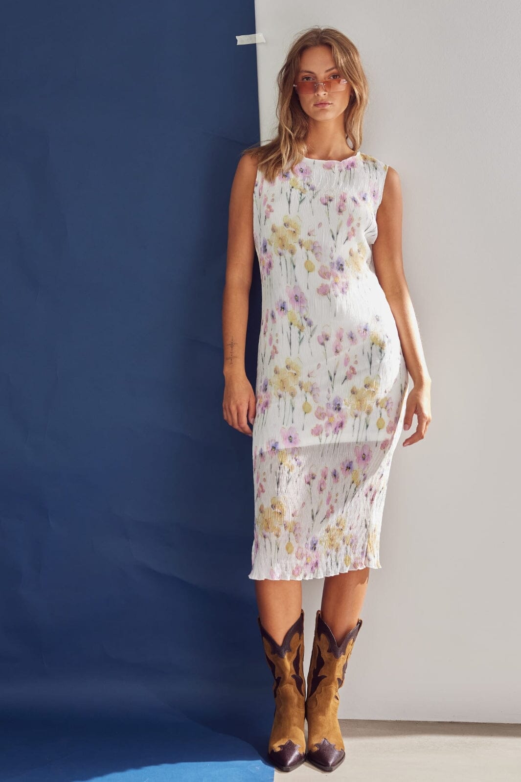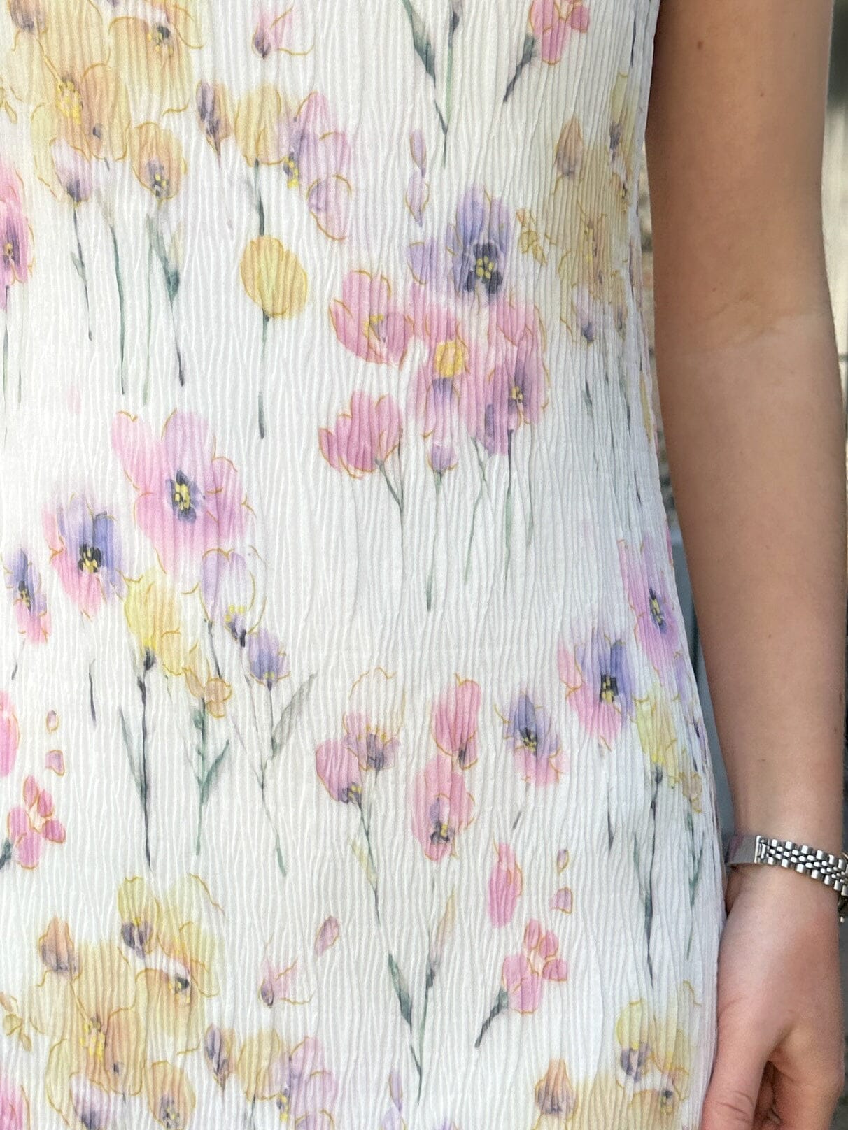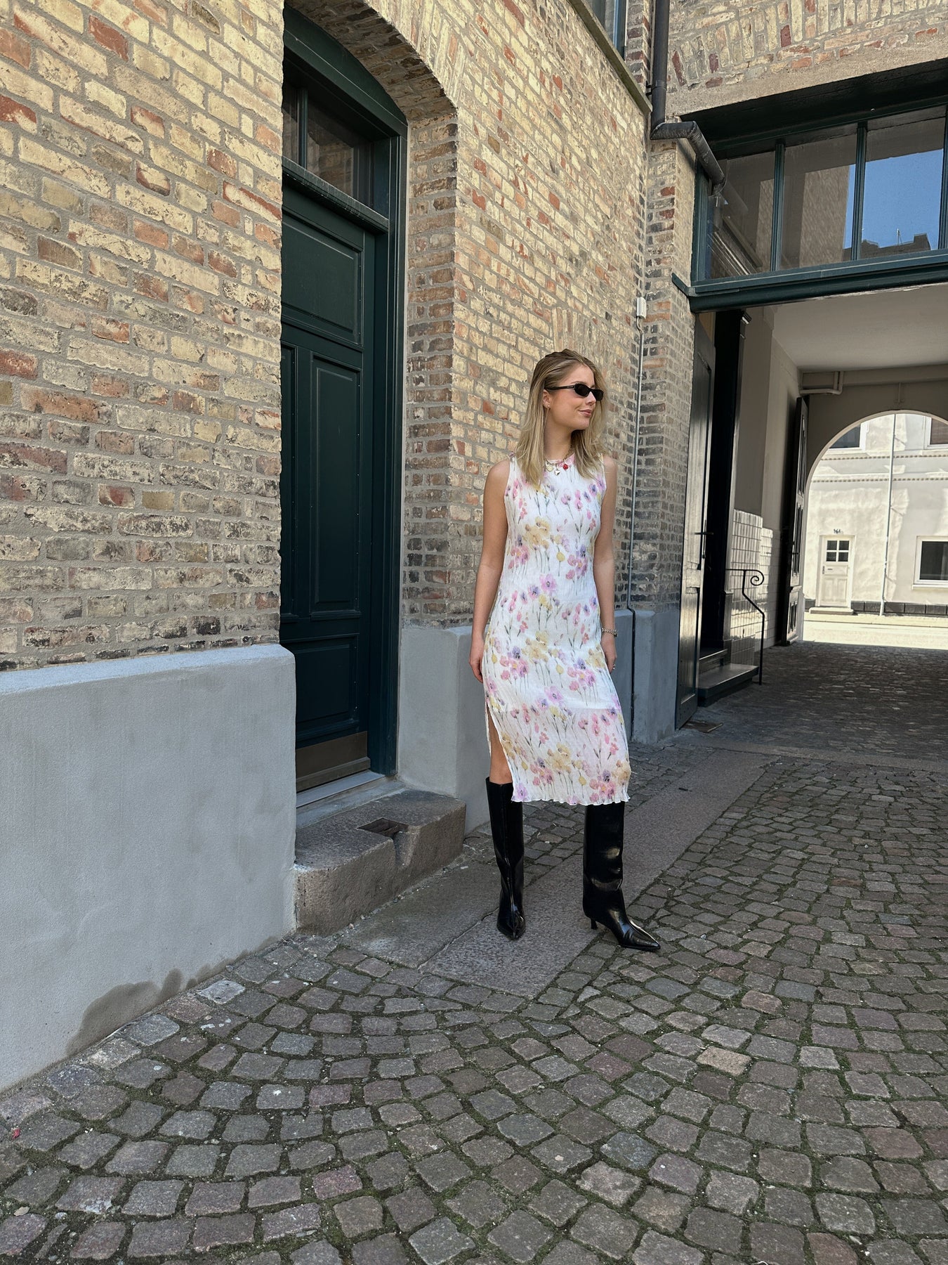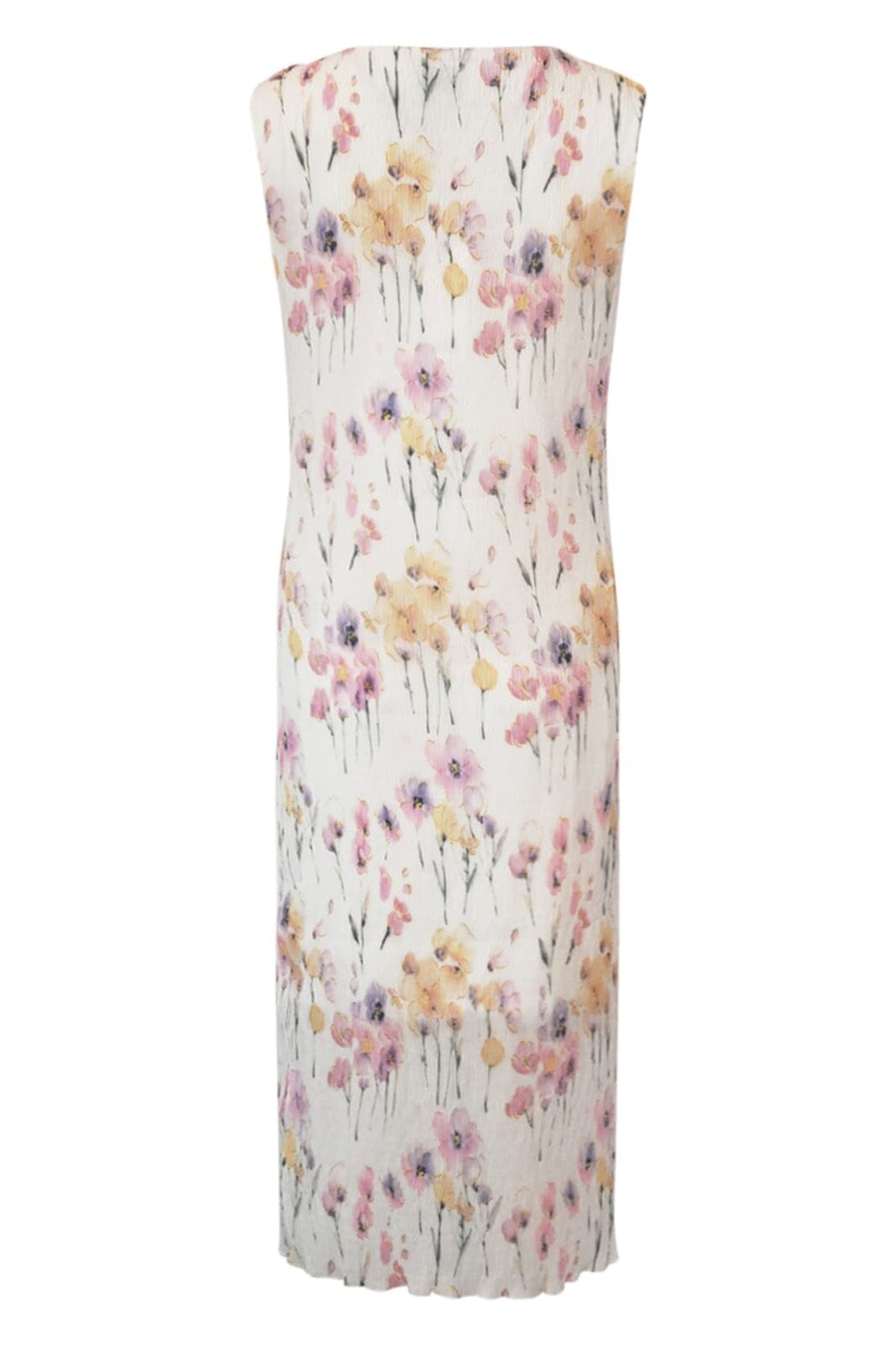 Knelang kjole fra Noella med et blomstermønster i hvite, rosa og lilla nyanser. Kjolen har en slank passform og feminine detaljer som bølget kant og slits.