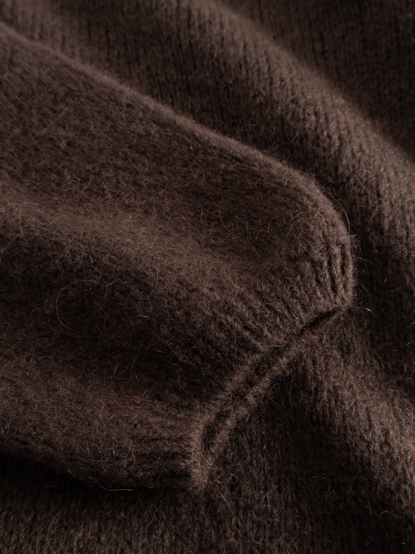 Mørkebrun strikkegenser med puffede ermer og cropped design. Den myke strikken har en rund halsutskjæring og en løs passform som gir god bevegelsesfrihet.