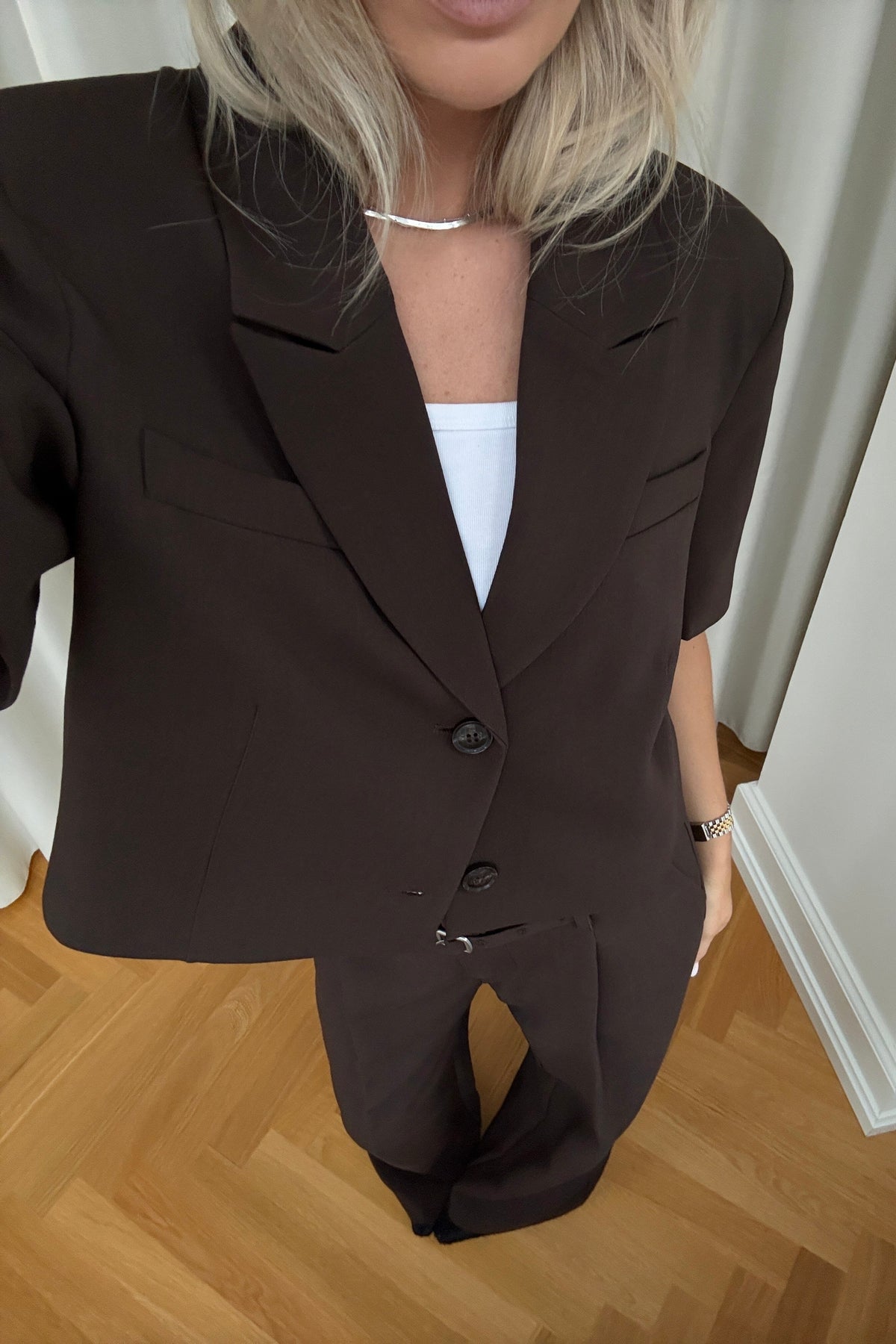 Kort blazer fra Noella i sjokoladebrun farge. Blazeren har en oversized passform og en kort lengde.