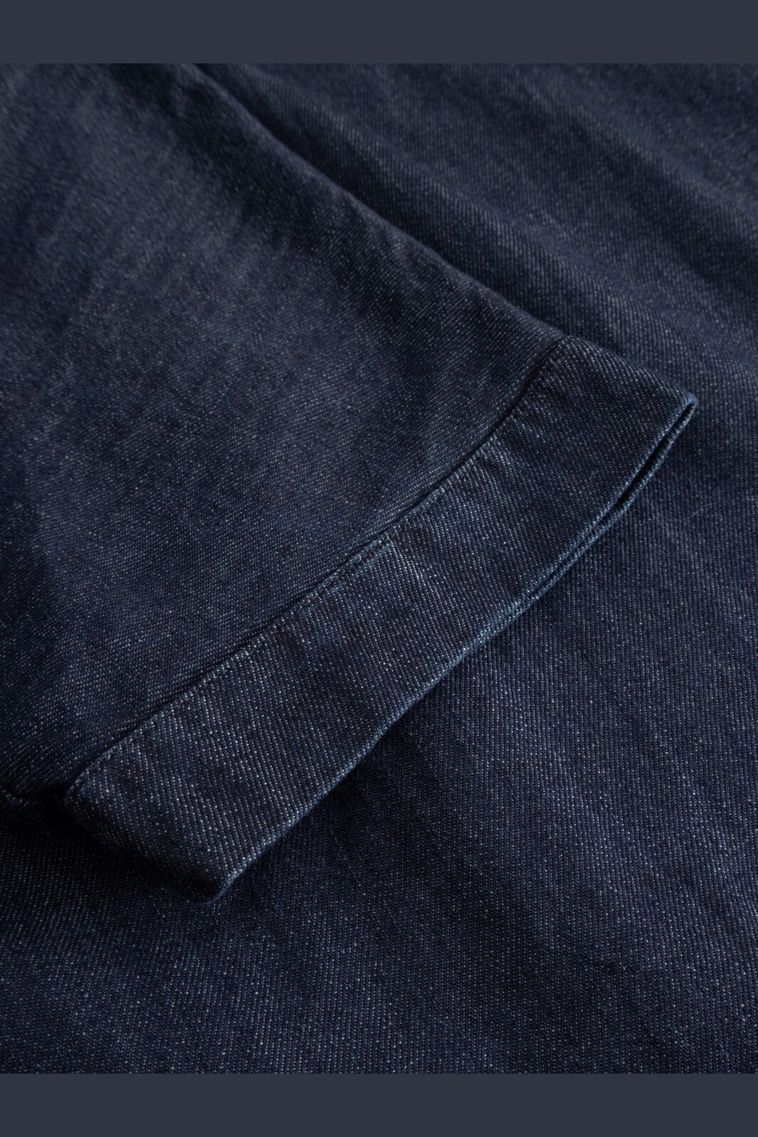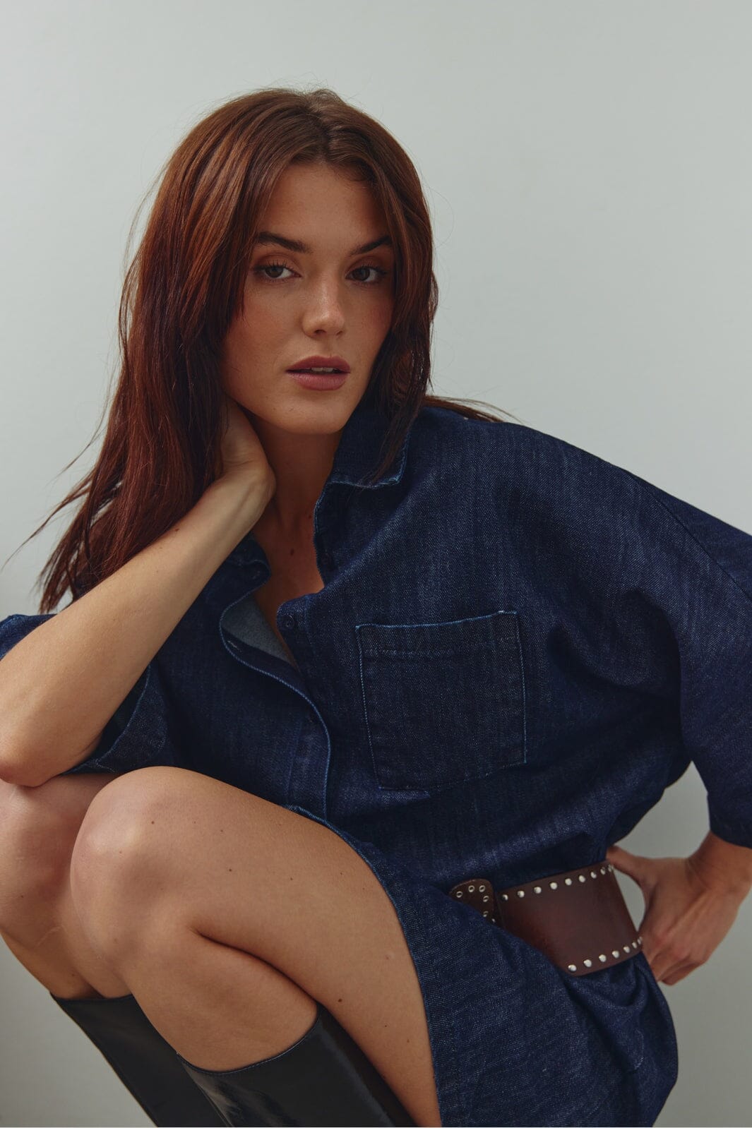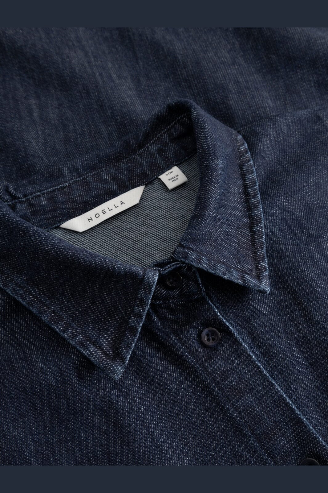 Blå denimkjole fra Noella, laget av 100 % bomull. Kjolen har en løs passform, korte ermer og en klassisk krage med knappelukking foran.