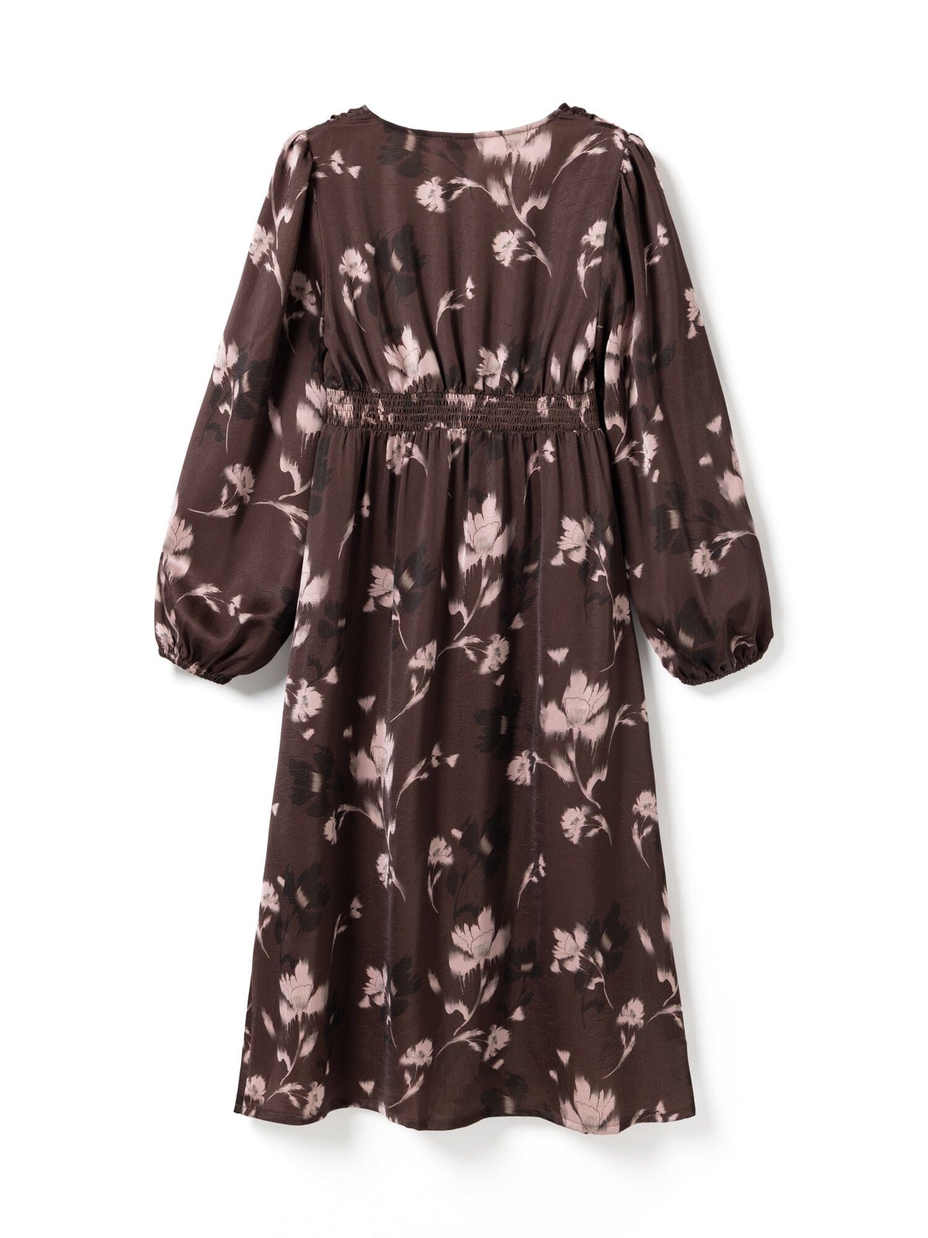 Kjole fra Noella i burgundernyanser med et blomsterprint i røde og brune toner. Kjolen har lange ermer, V-utringning med knappdetaljer og et markert midjestykke.