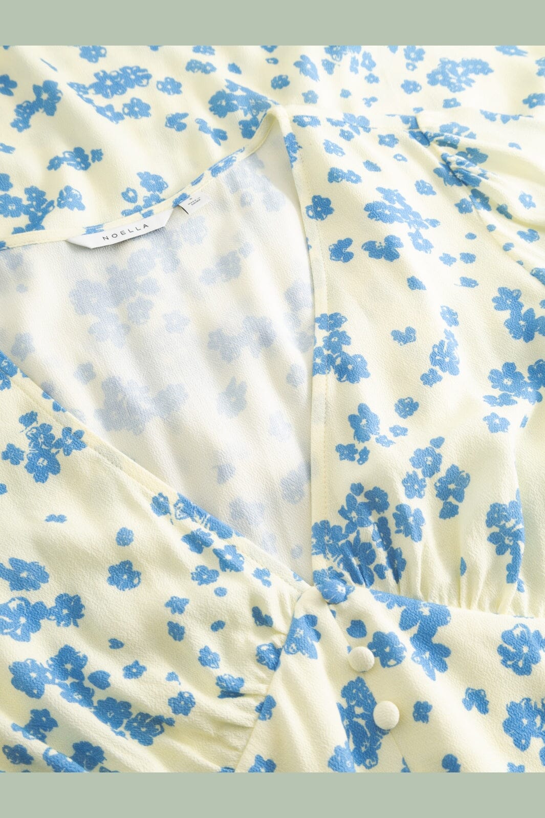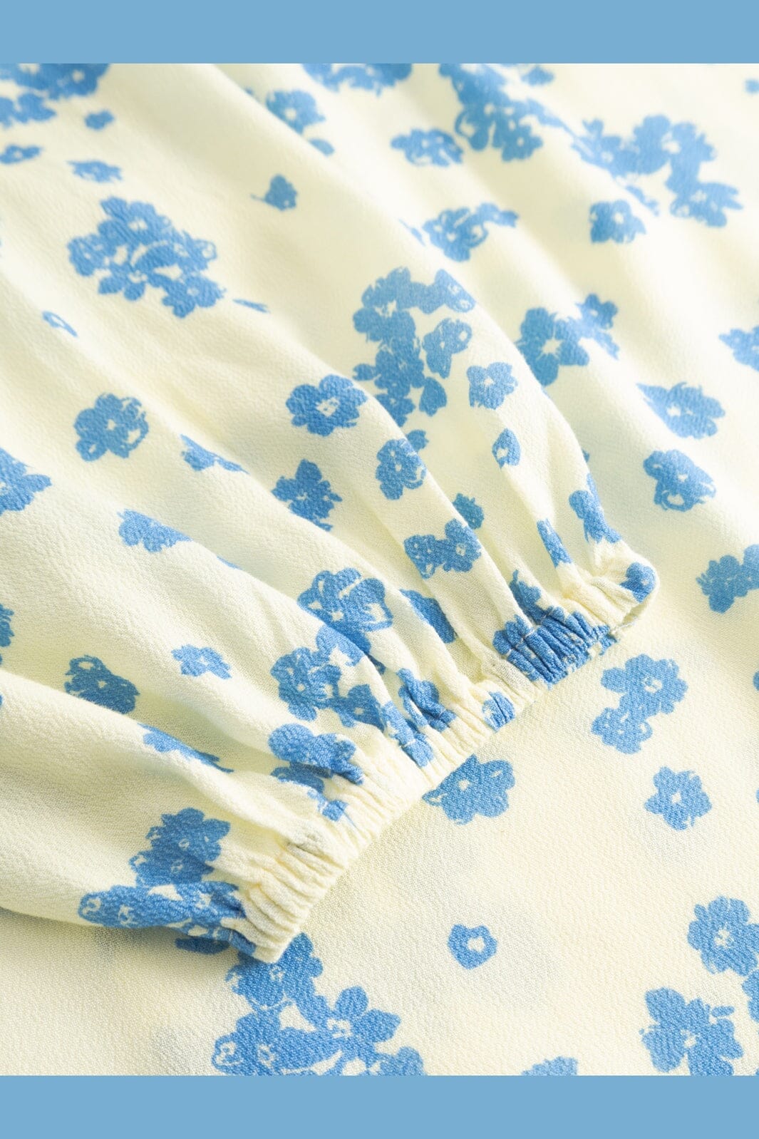 Maksikjole fra Noella i gul farge med blått blomstertrykk. Kjolen har dyp V-utringning, lange ermer og rekker ned til anklene.