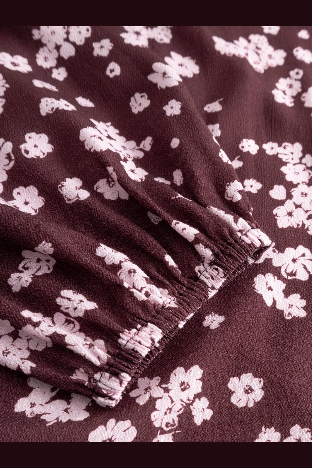 Maxikjole fra Noella i burgunder med blomsterprint i rosanyanser. Kjolen har V-utringning, lange ermer og volanger.