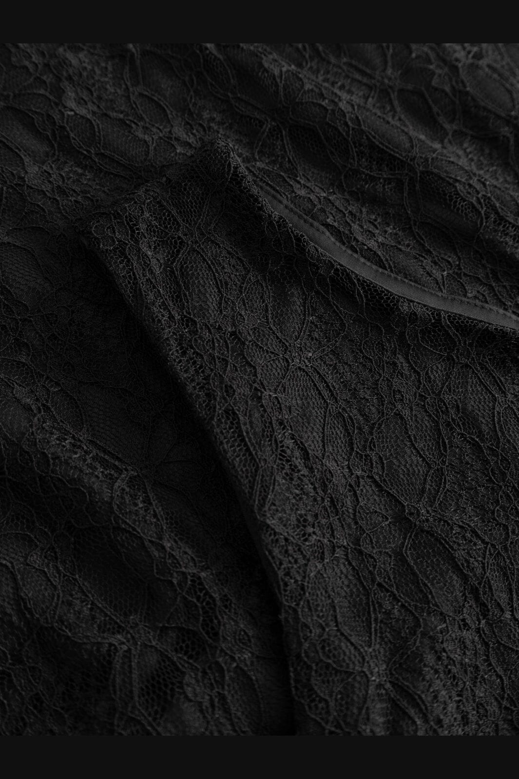Svart kjole fra Noella i blonde. Kjolen passer til bryllup, fester og formelle anledninger med sitt off-shoulder-design og asymmetriske snitt.
