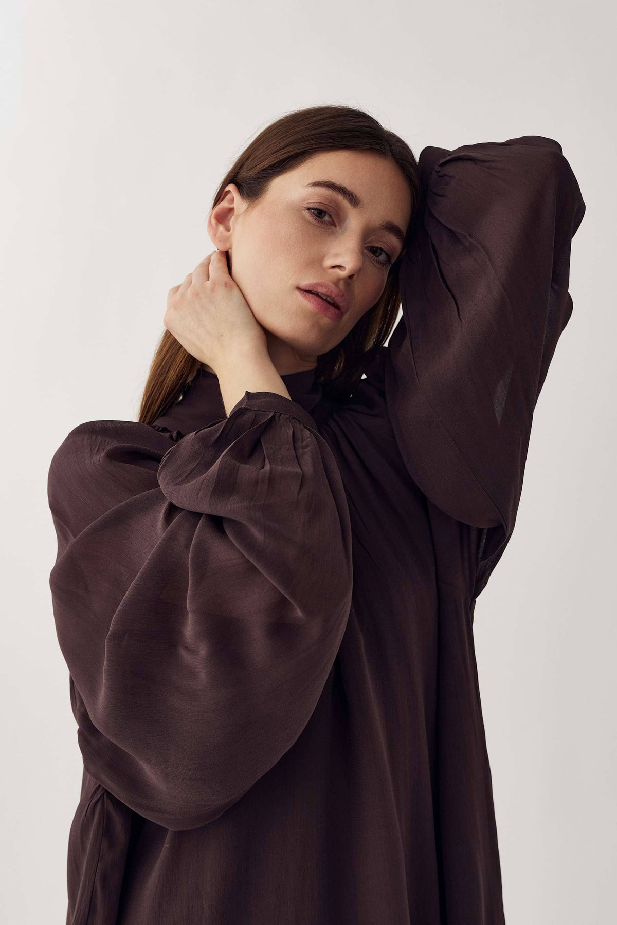 Sjokoladebrun kjole fra Noella, laget av 100 % viskose. Kjolen har en høy halsutringning med sløyfe og lange ermer med elastiske mansjetter.
