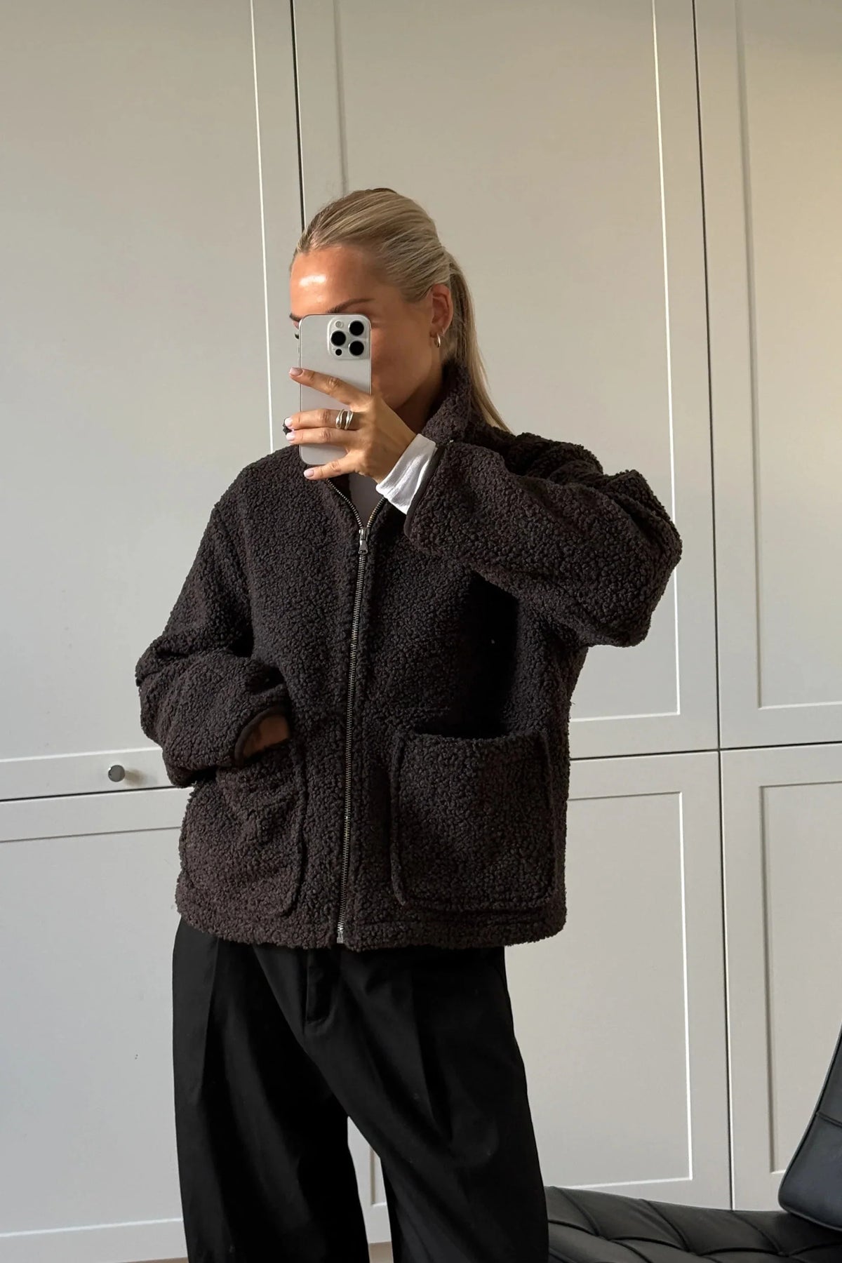 Jakke fra Noella i brun sjokoladefarge. Jakken er laget av mykt teddystoff med en fluffy tekstur og har en høyhalset krage.
