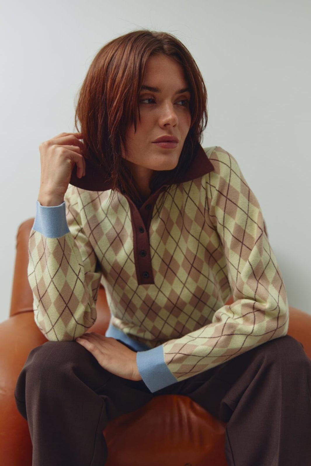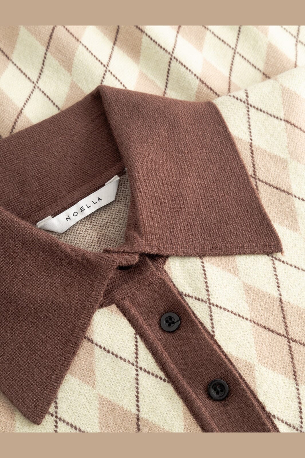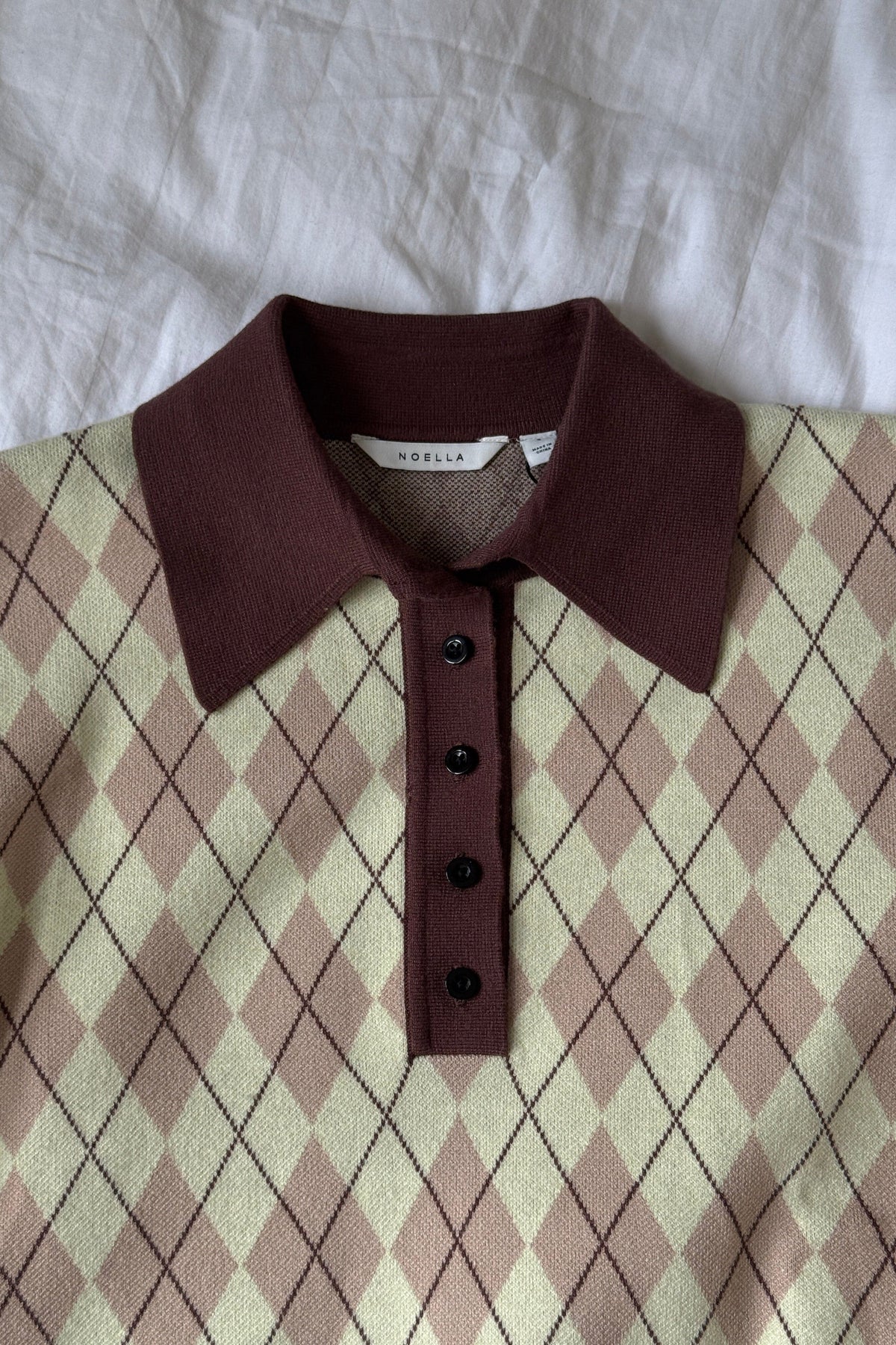 Strikkegenser fra Noella i gul og brun rutet intarsiastrikk. Genseren har brun polokrage, lange ermer med lyseblå mansjetter og en slim fit-passform.
