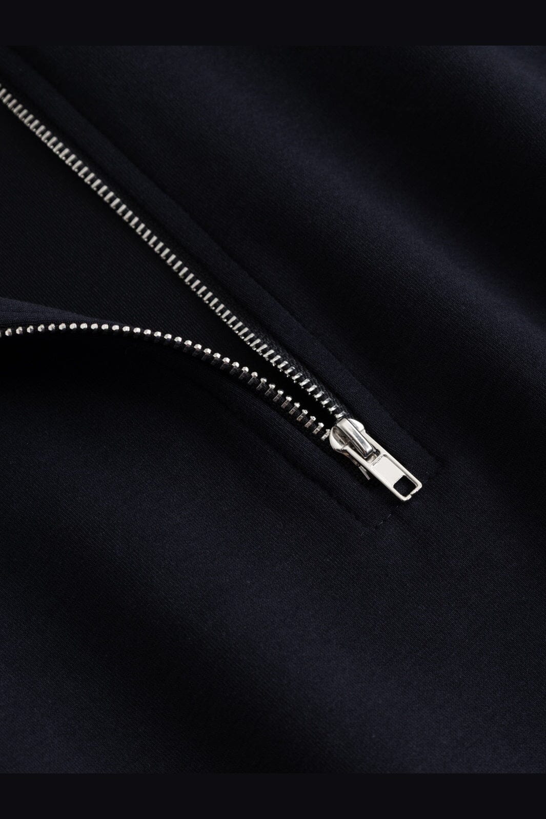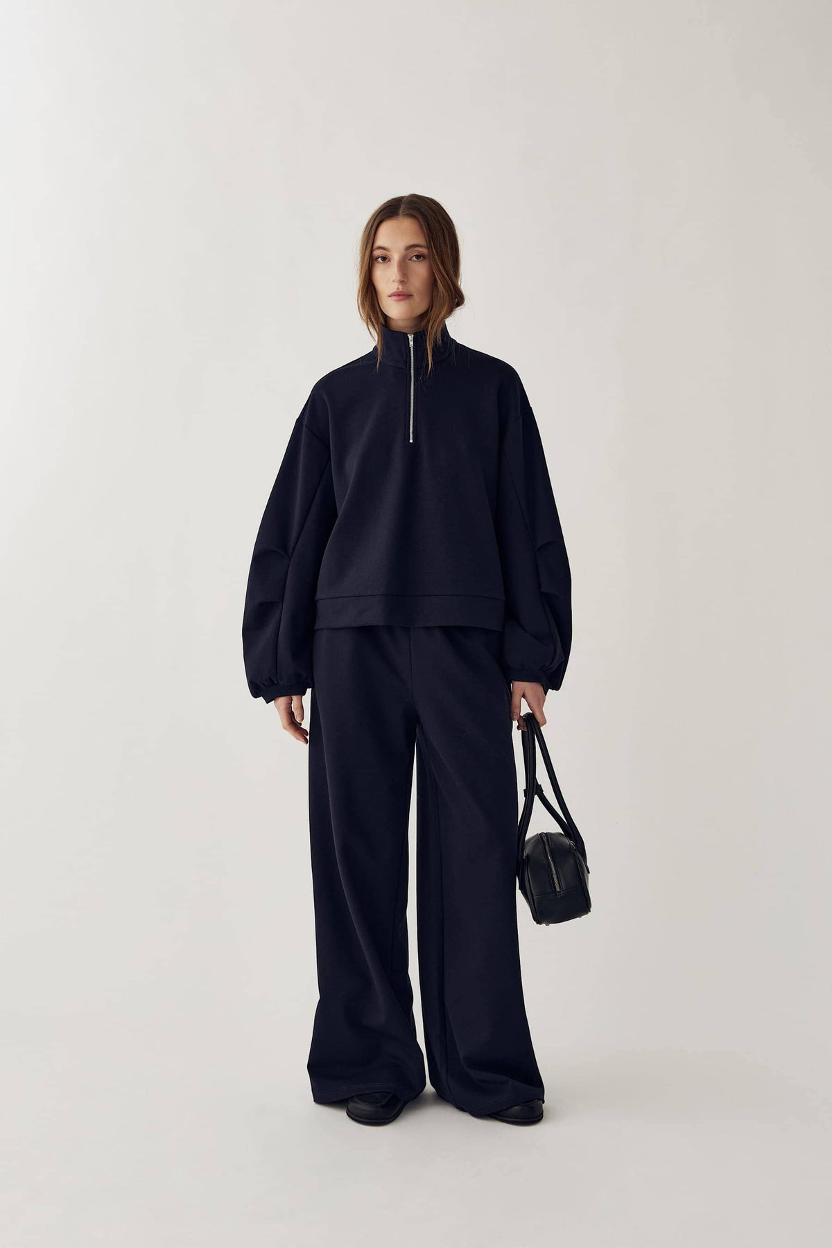 Mørkeblå topp fra Noella, laget av 100 % polyester. Toppen har høy hals med halv glidelås og lange ermer med elastiske mansjetter.