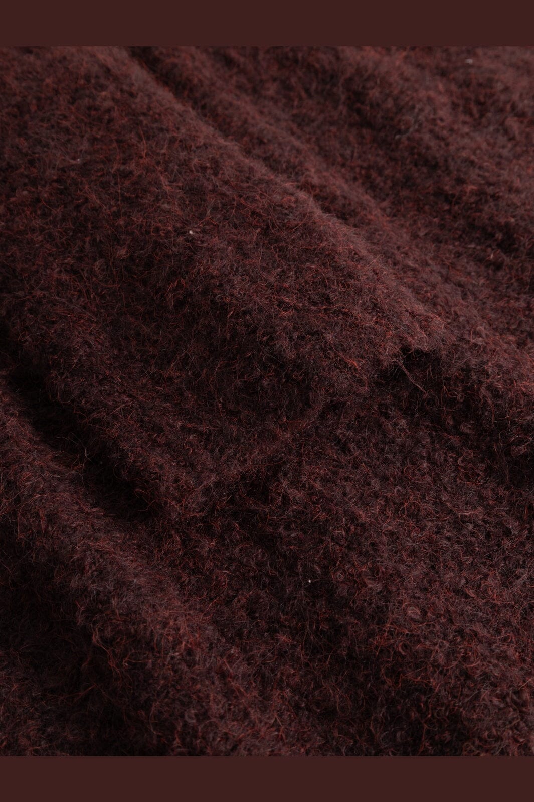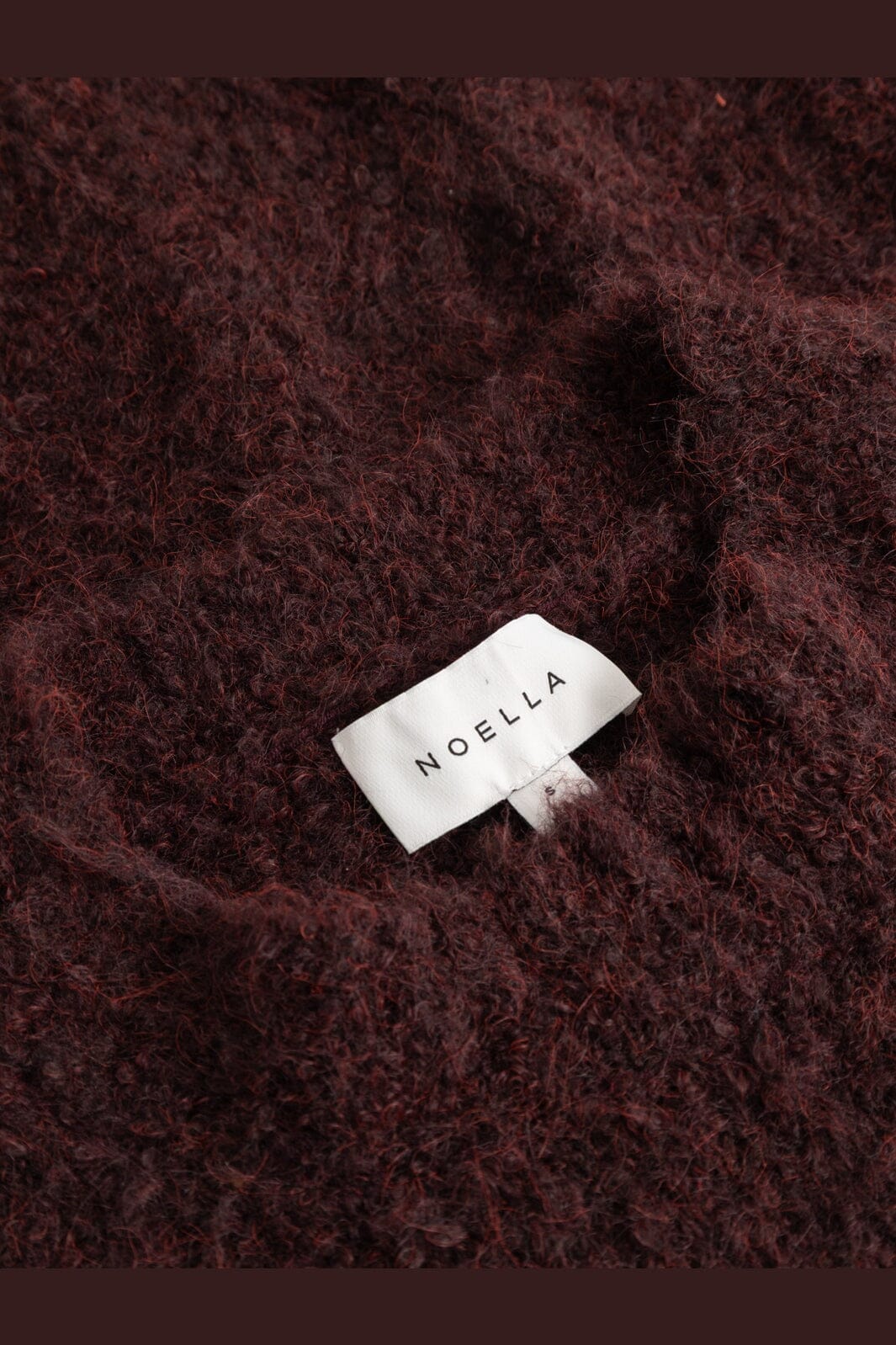 Strikkegenser fra Noella, laget av bouclégarn i en dyp vinrød nyanse. Genseren har en myk og fluffy struktur.