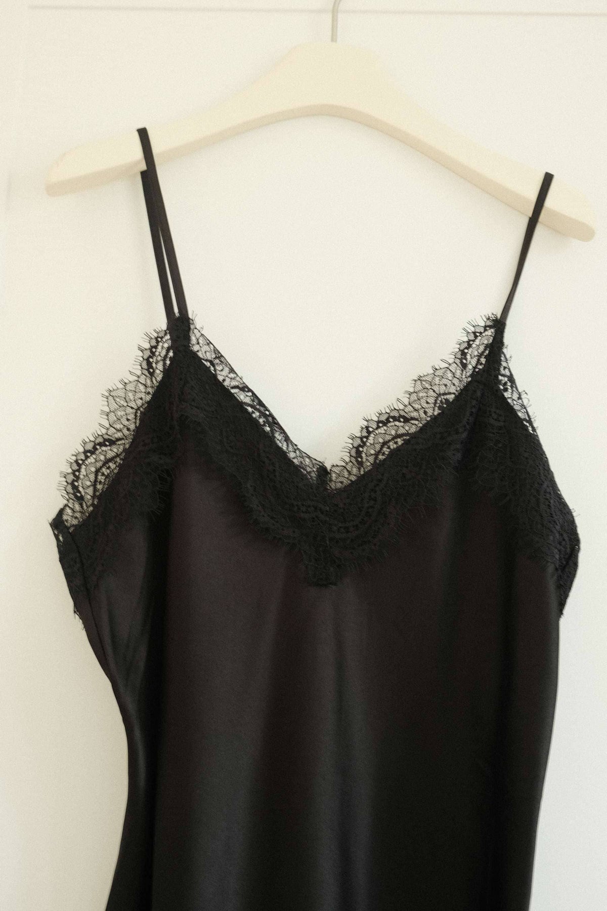 Sort kjole fra Noella i sateng. Kjolen har tynne, justerbare stropper, blondedetaljer og en asymmetrisk kant som går til kneet.