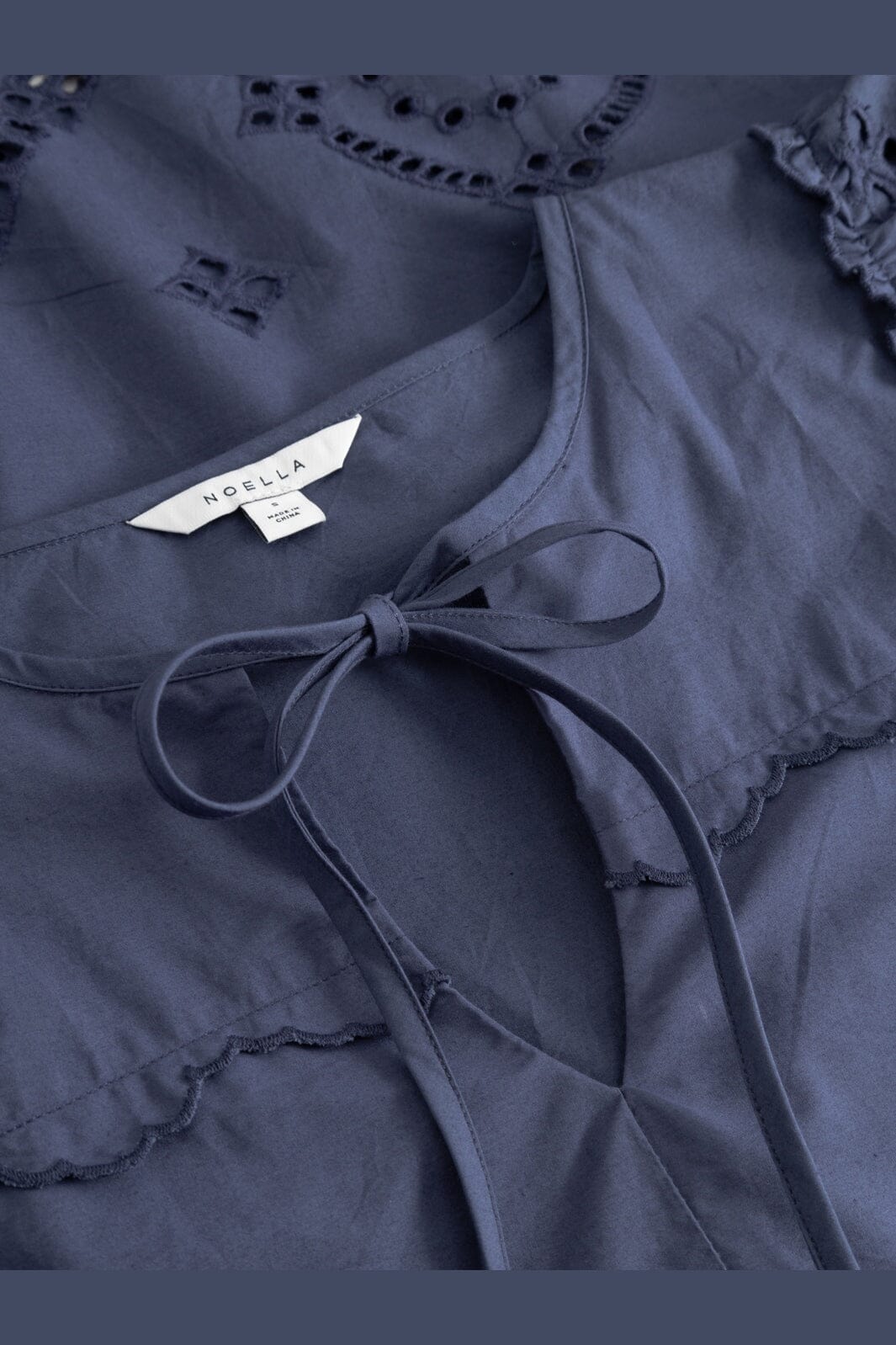 Kjole fra Noella i støvet blå. Laget av 100 % bomull med broderte detaljer, knytebånd og blonder.
