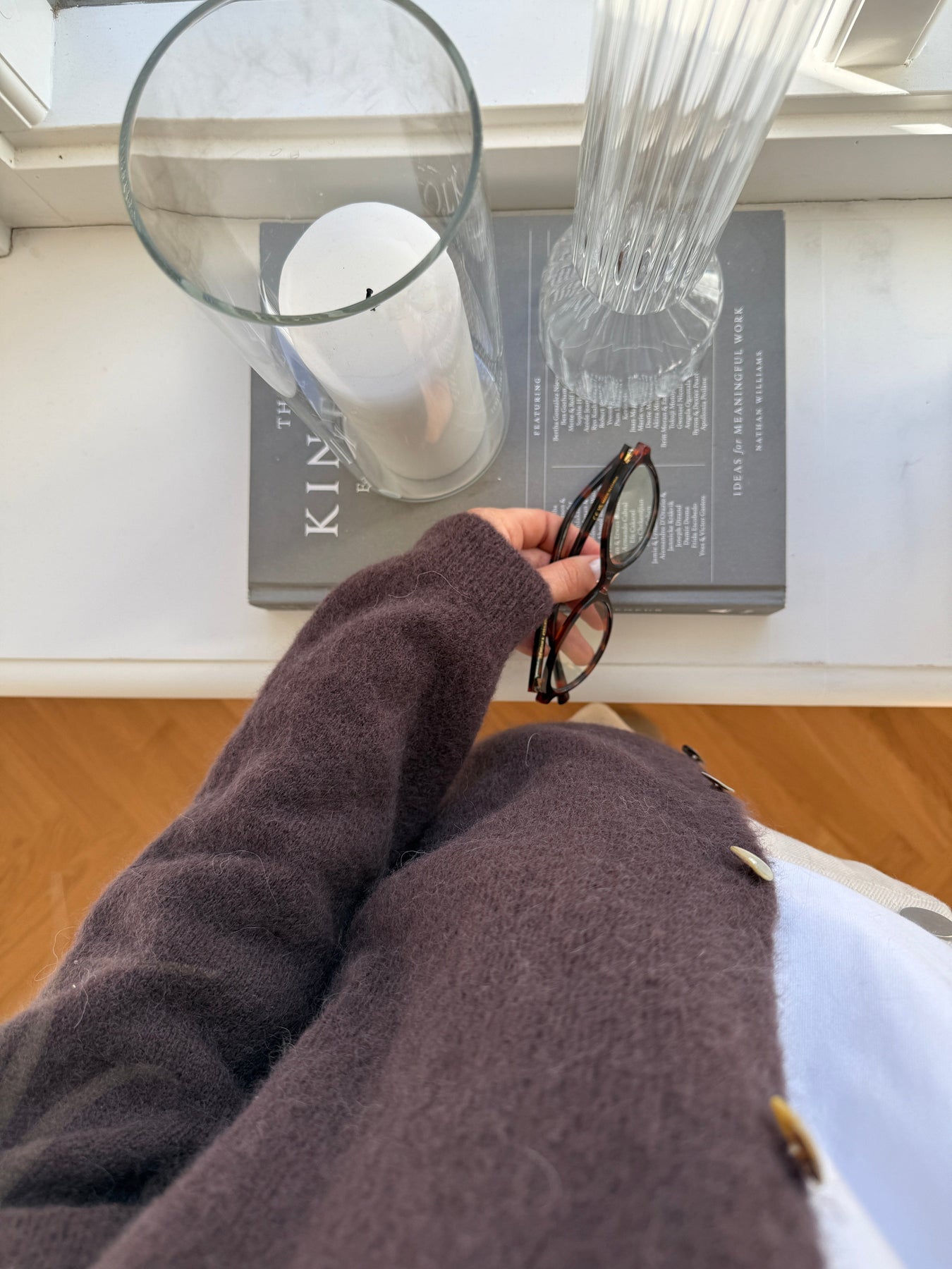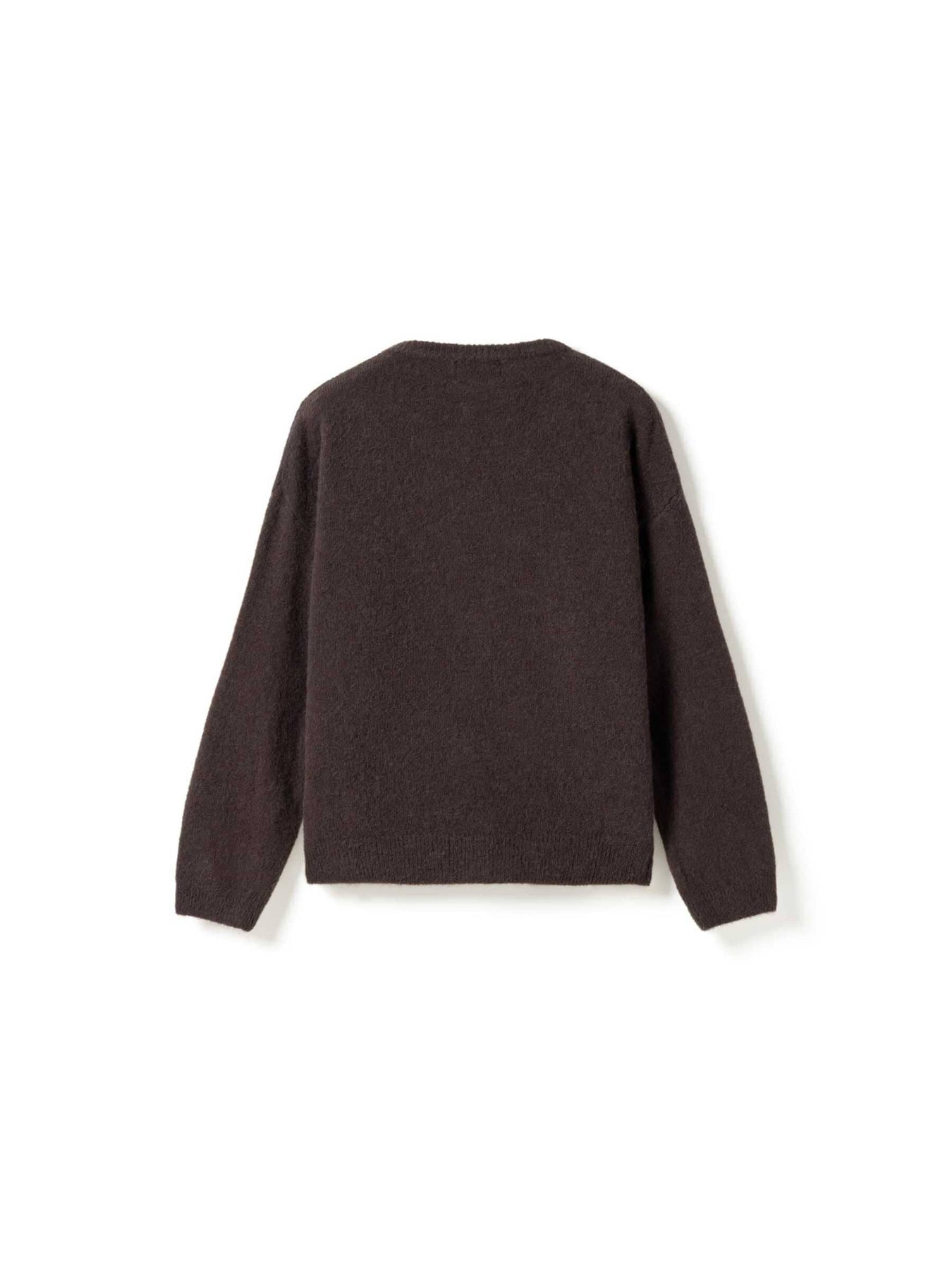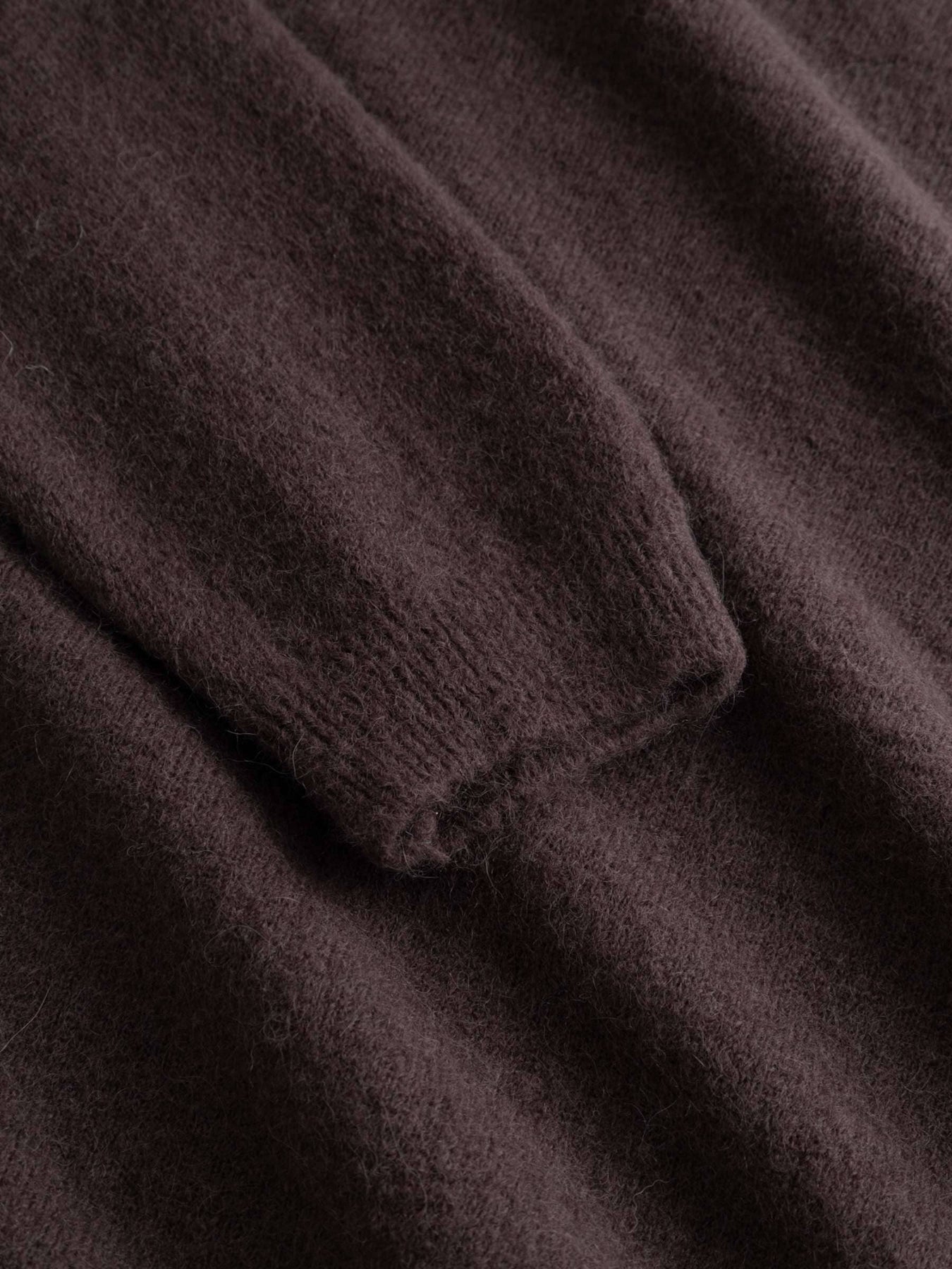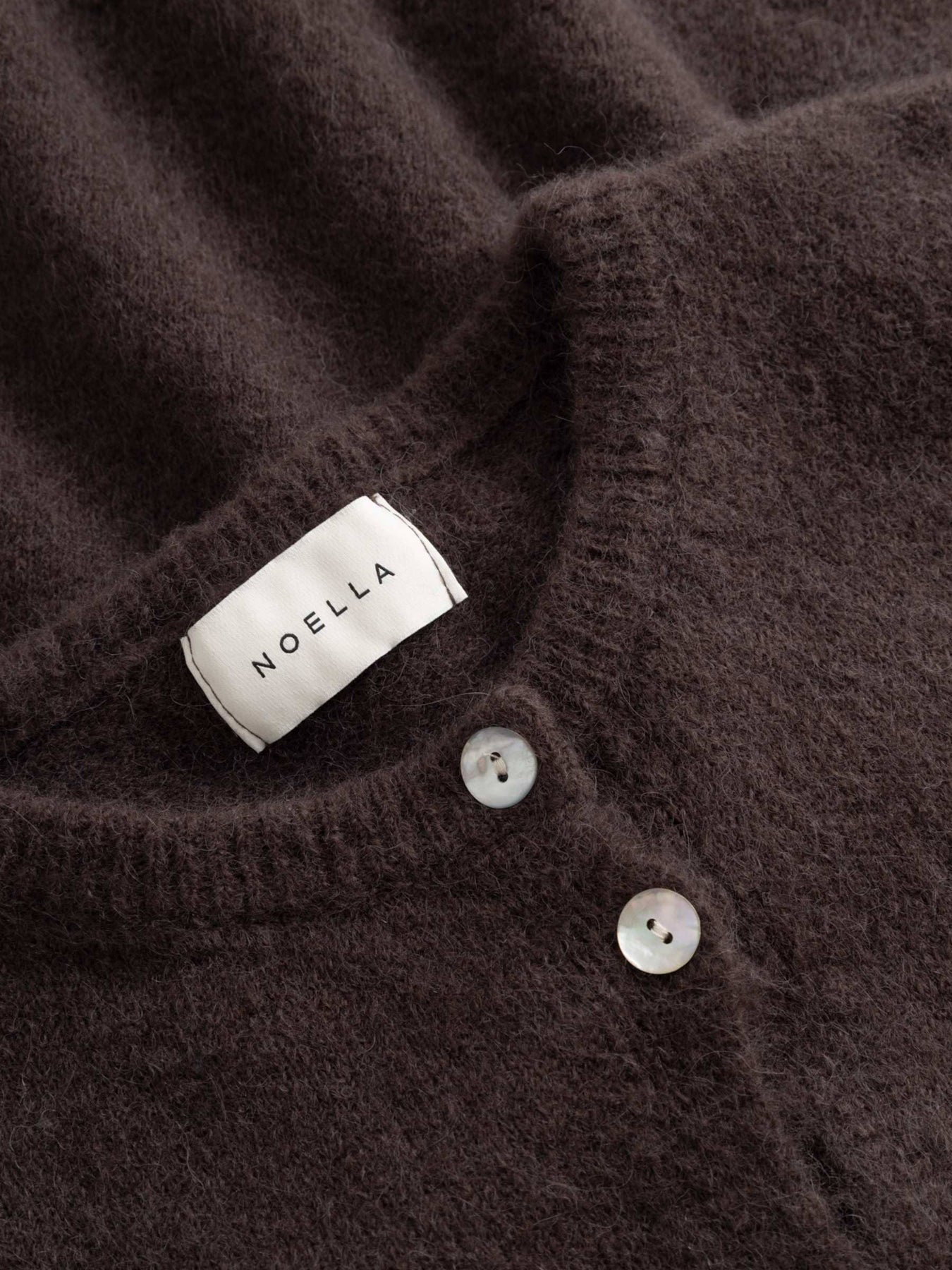 Strikket cardigan fra Noella i sjokoladebrun. Cardiganen har en løs passform, knappelukking foran og en rund halsutringning med lange ermer.