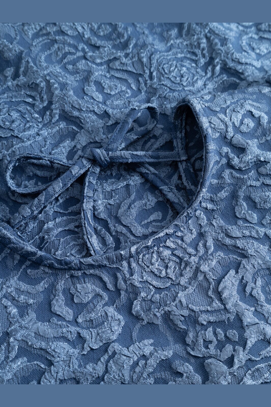Lang kjole fra Noella i støvete blå med blomstermønster. Kjolen er laget av jacquardstoff med en struktur som gir stoffet dybde.