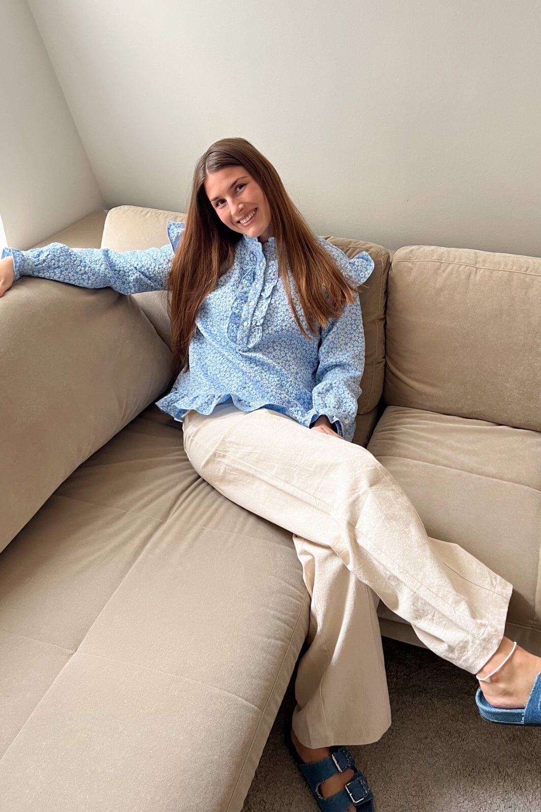 Lys blå bluse fra Noella med vevd blomsterdesign. Blusen har rynker ved skuldrene og en knappelukking foran med rynkedetalj. Den høye halsen og oversized passform gir god bevegelsesfrihet.