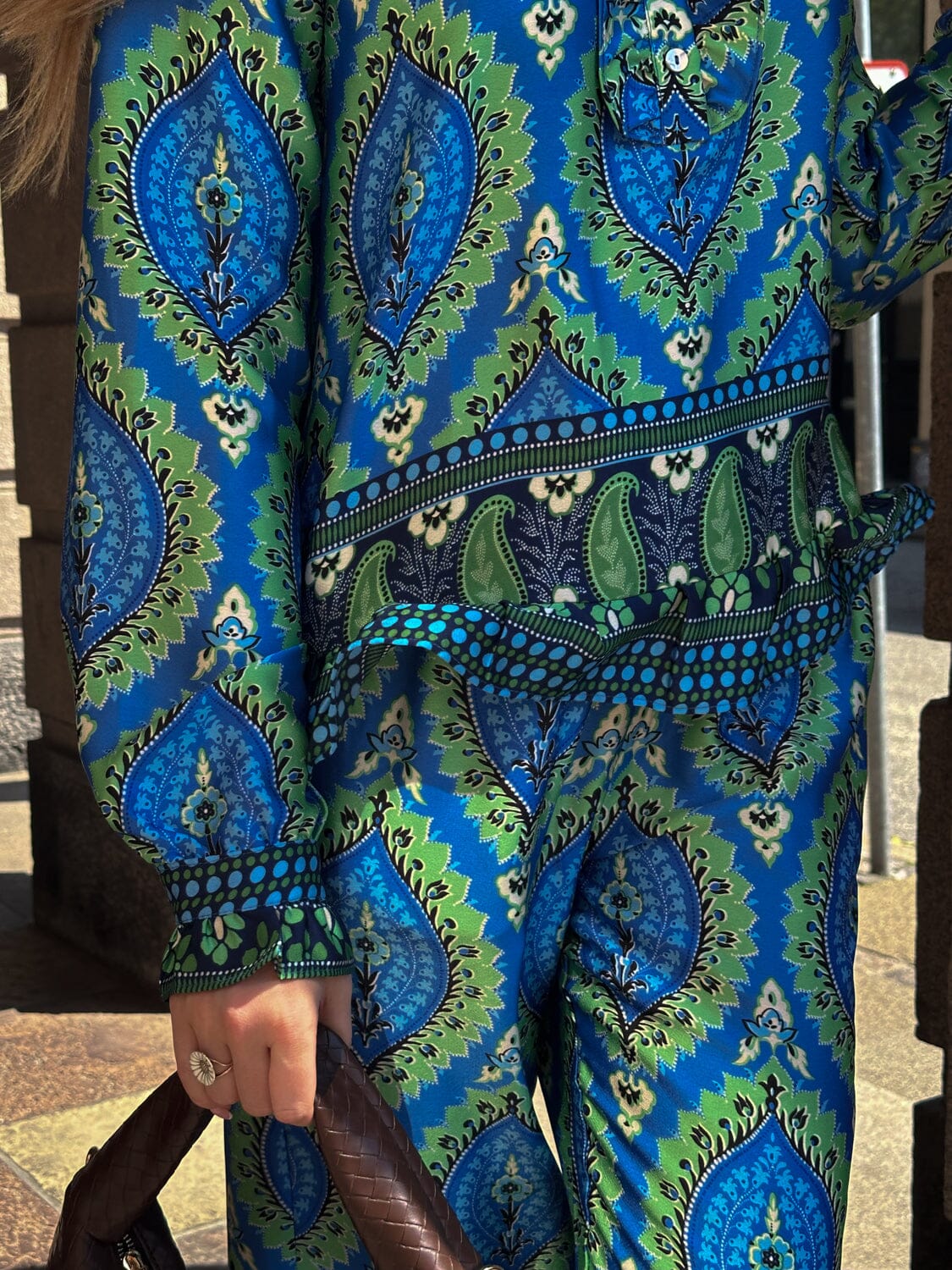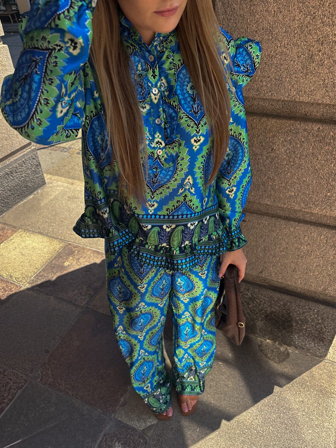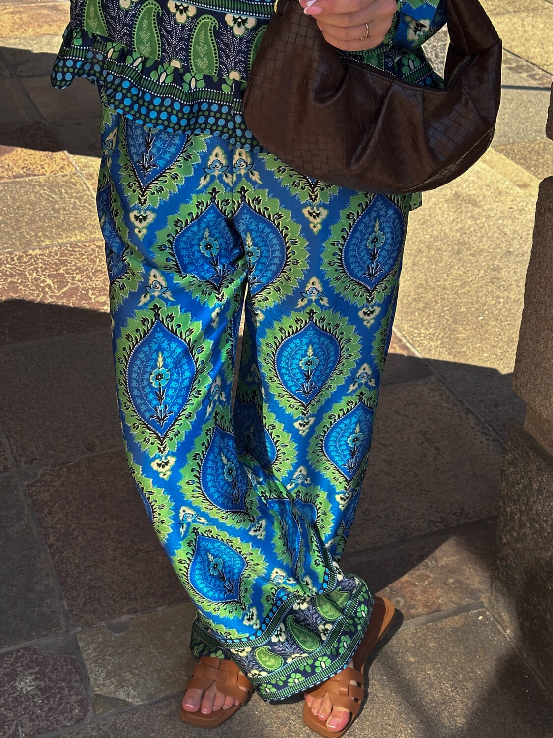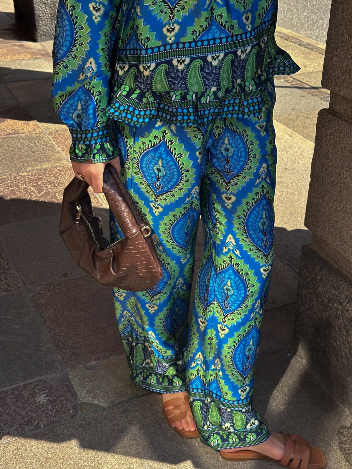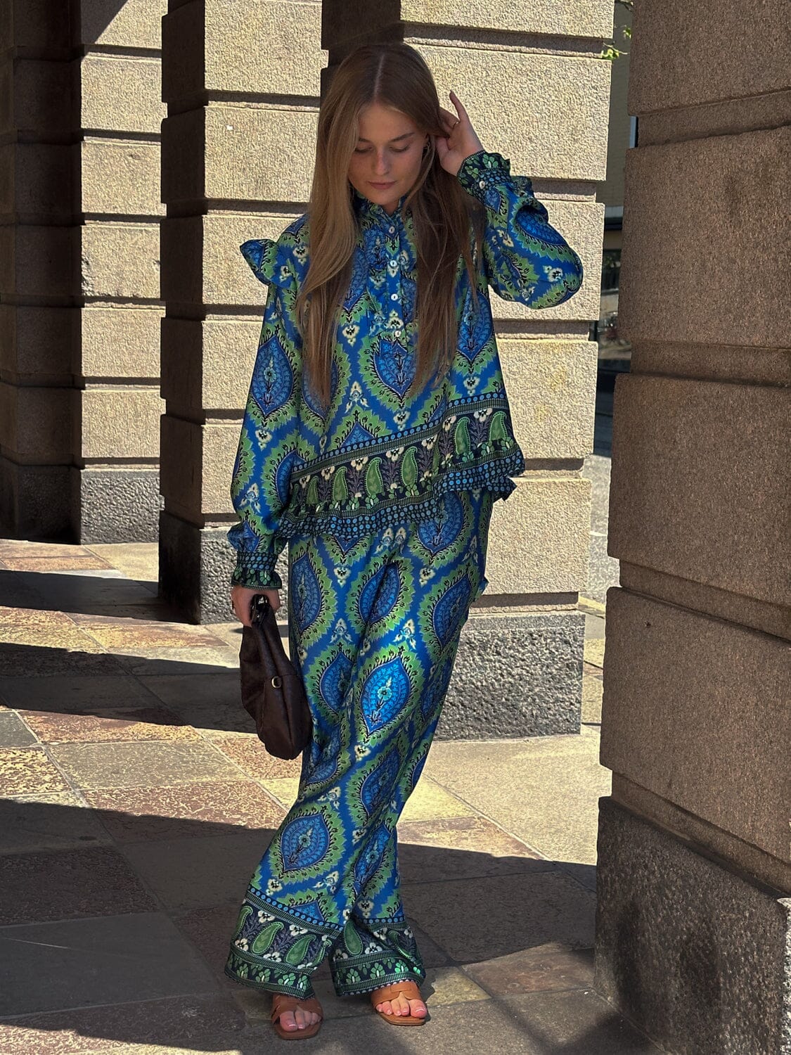 Bukser fra Noella med et blågrønt paisleymønster. Buksene har en dekorativ kant nederst og et snøre i livet som gir mulighet for å justere passformen.