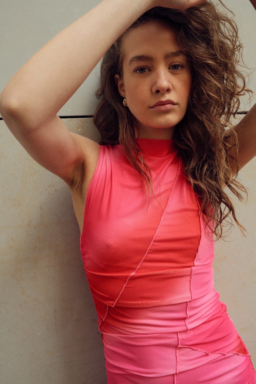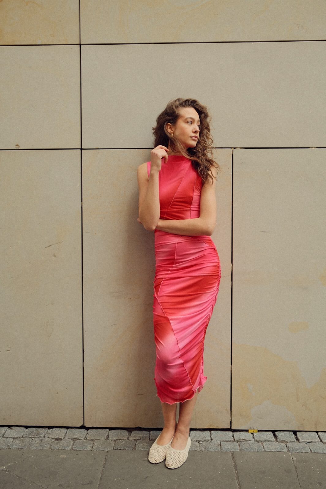 Ankellang kjole fra Noella med høy hals og ærmeløst design. Kjolen har et farveforløb fra rød til lyserød og mesh-detaljer med dekorative syninger.
